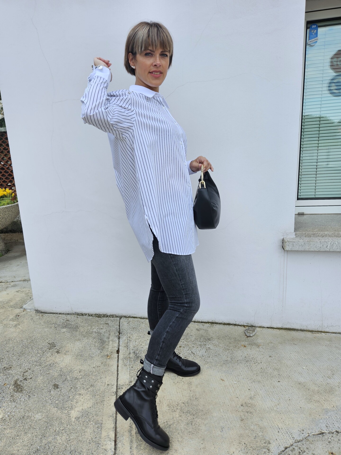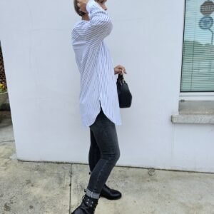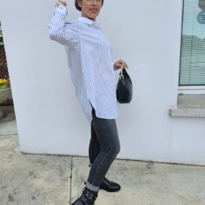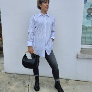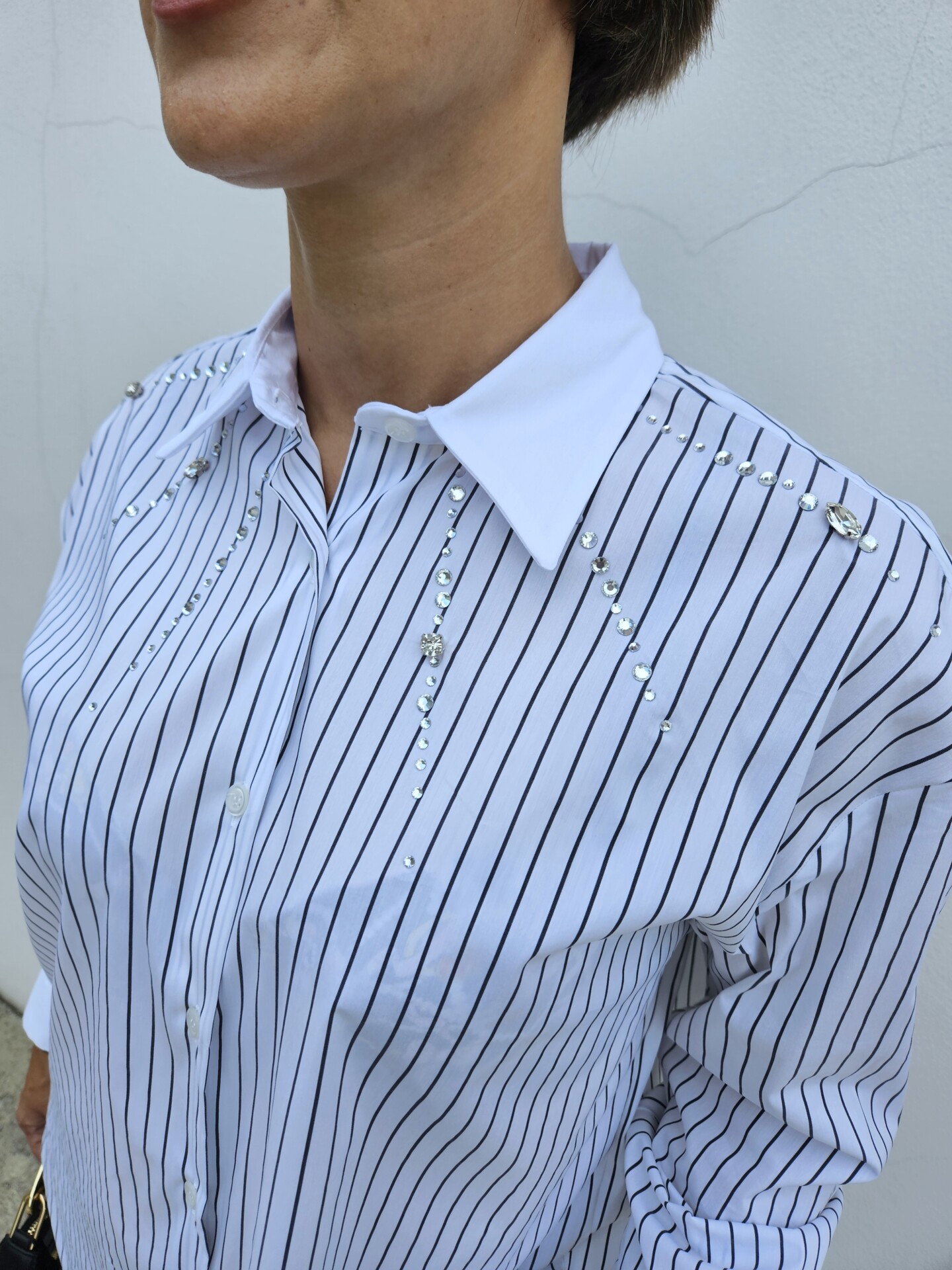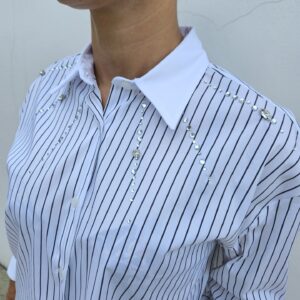 La camicia AFROGI è il capo ideale per chi ama farsi notare con stile. La fantasia a righe verticali slancia la figura, mentre le pietre e strass applicati impreziosiscono il capo con un tocco sofisticato. Perfetta sia per look da ufficio che per outfit serali dal mood chic.