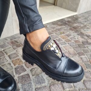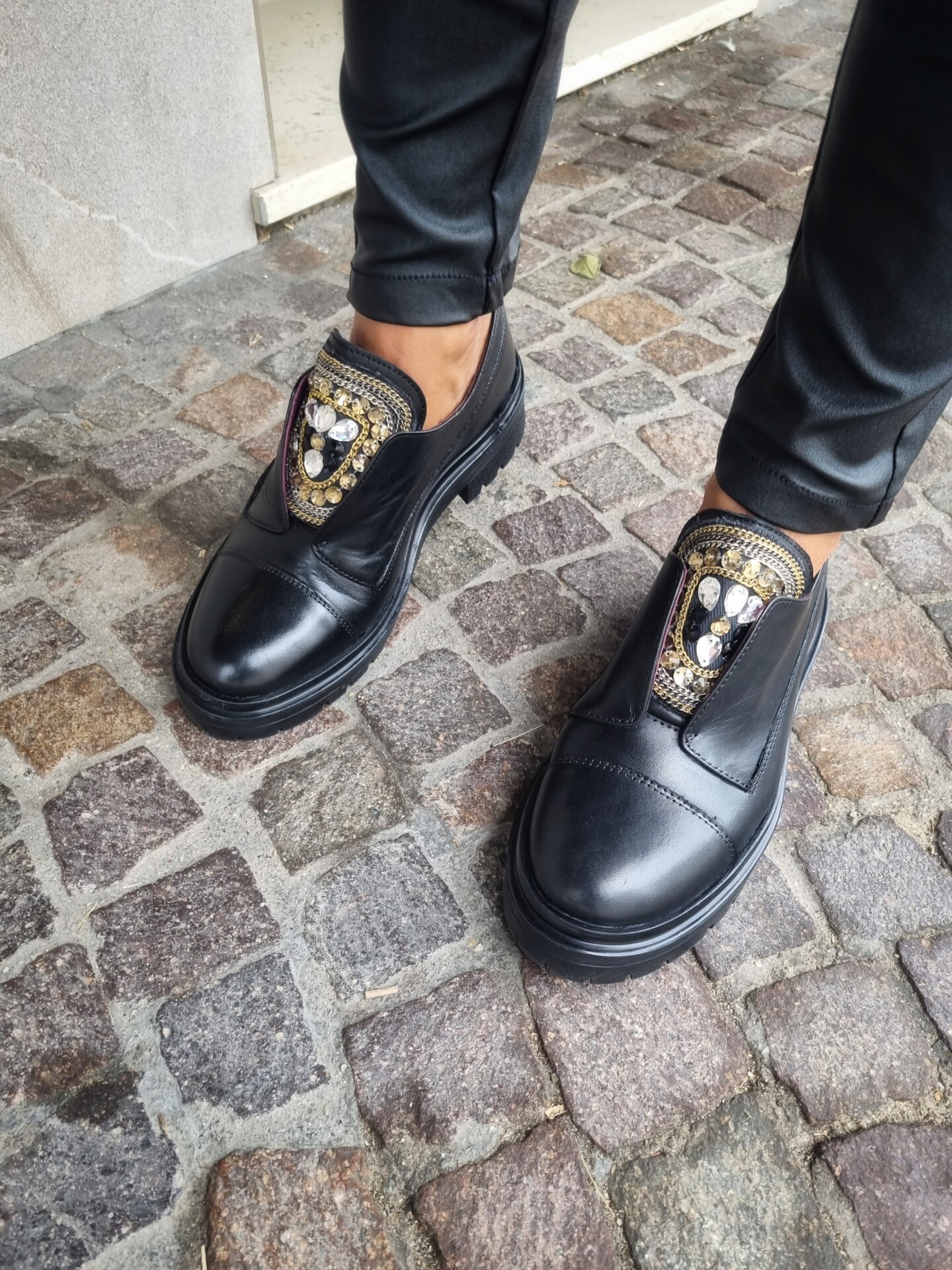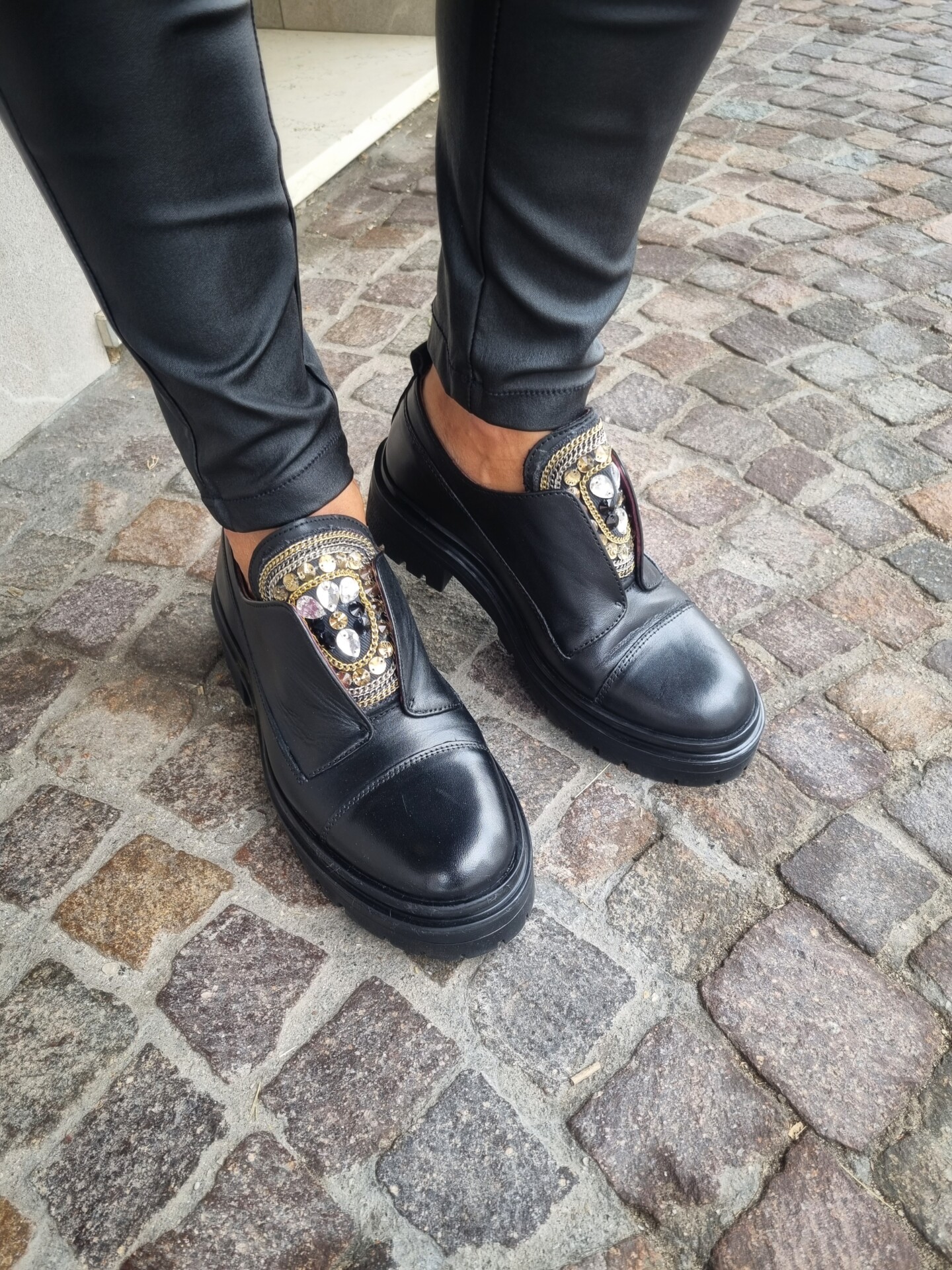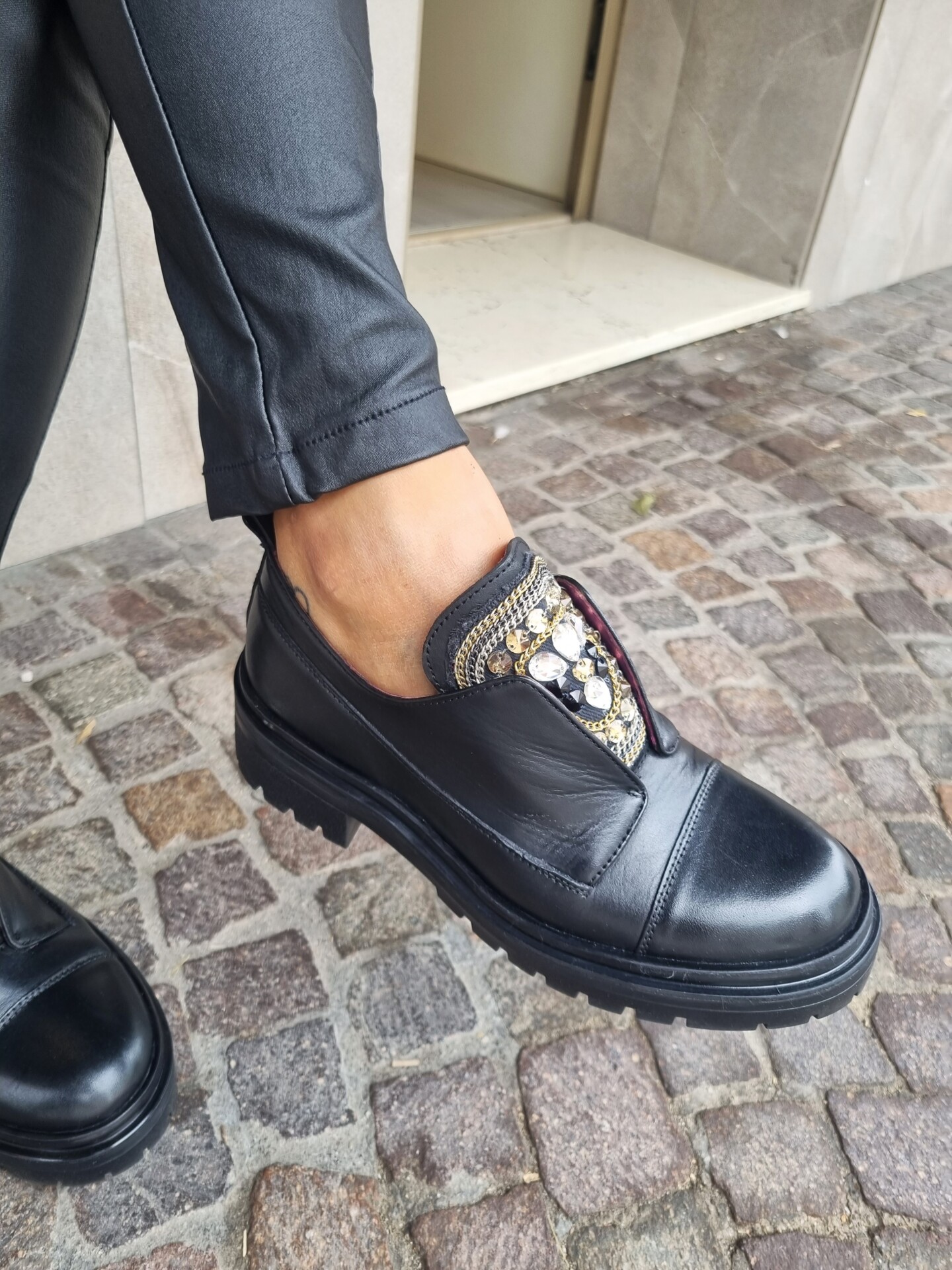 Scarpa mocassino in pelle dai volumi oversize, impreziosita da un sofisticato gioiello che alterna pietre e catenelle e che ricopre interamente il linguettone.