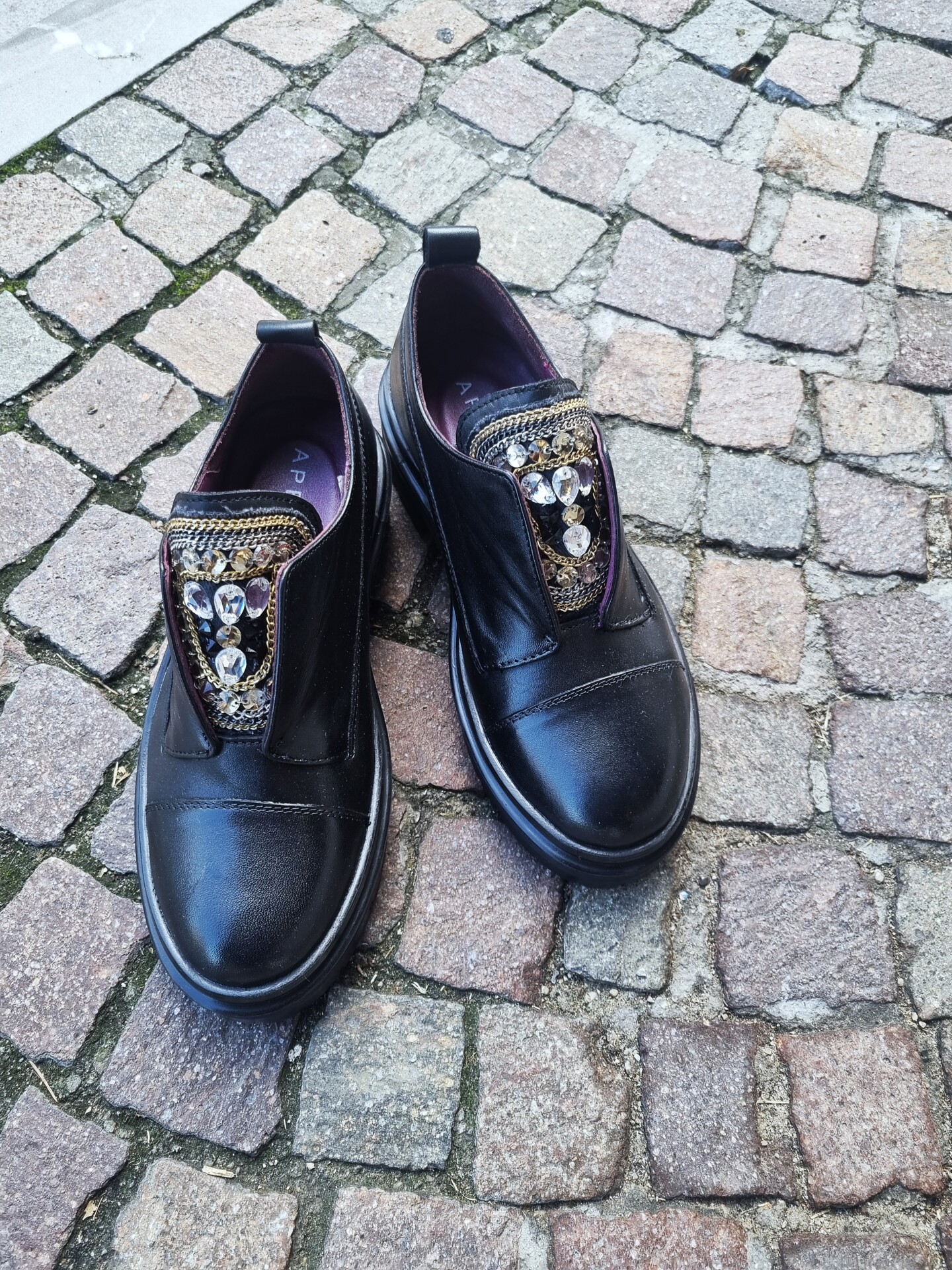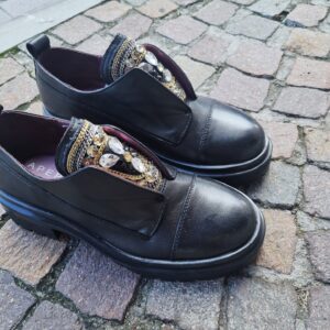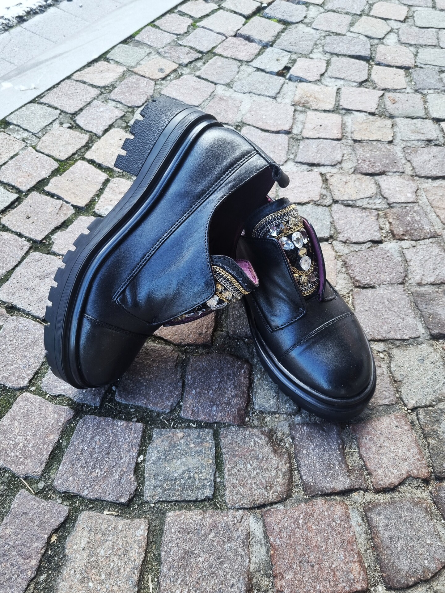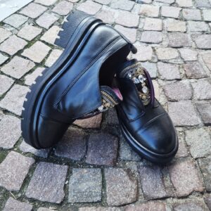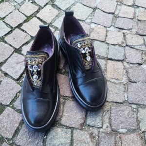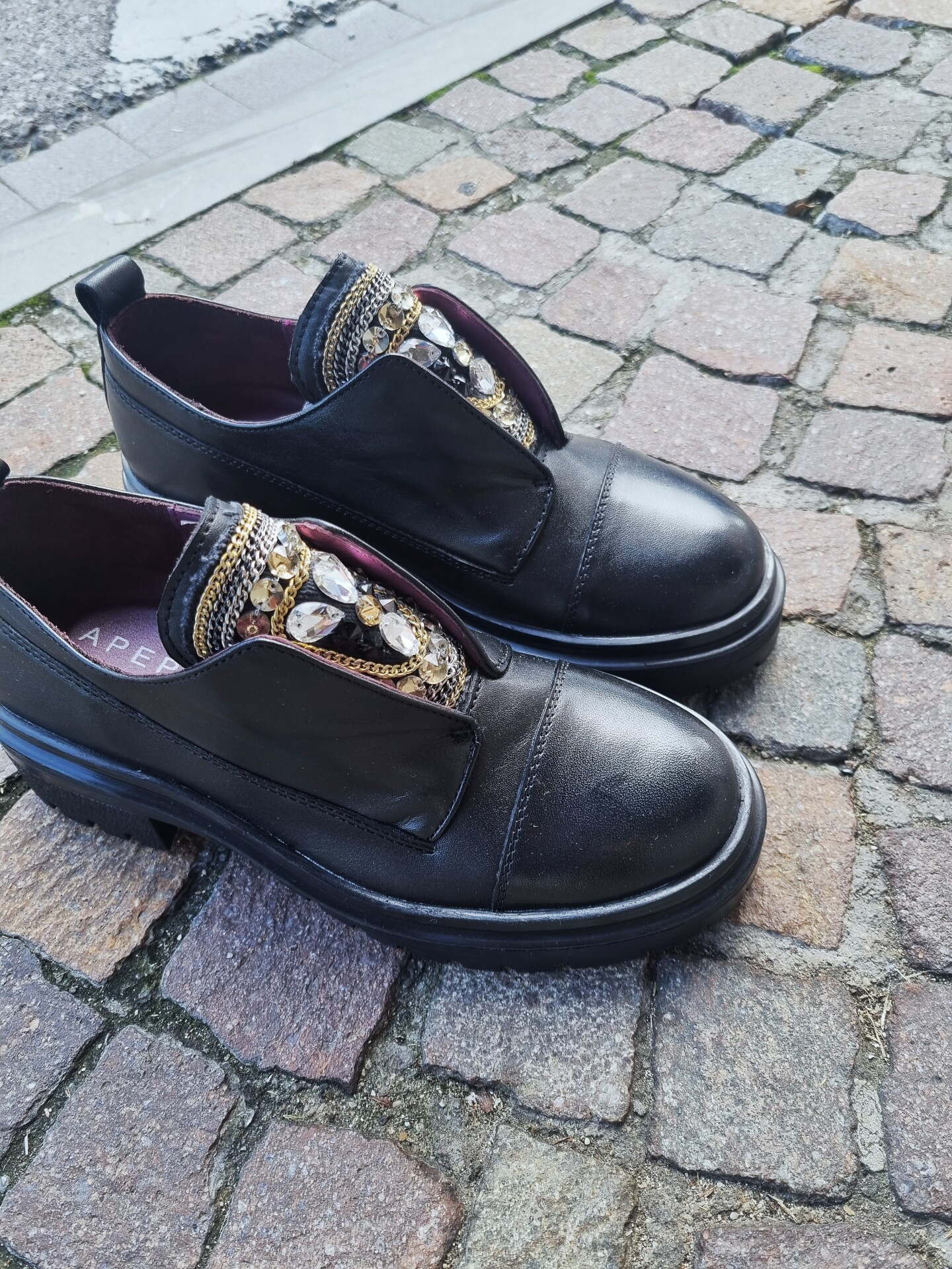 Scarpa mocassino in pelle dai volumi oversize, impreziosita da un sofisticato gioiello che alterna pietre e catenelle e che ricopre interamente il linguettone.