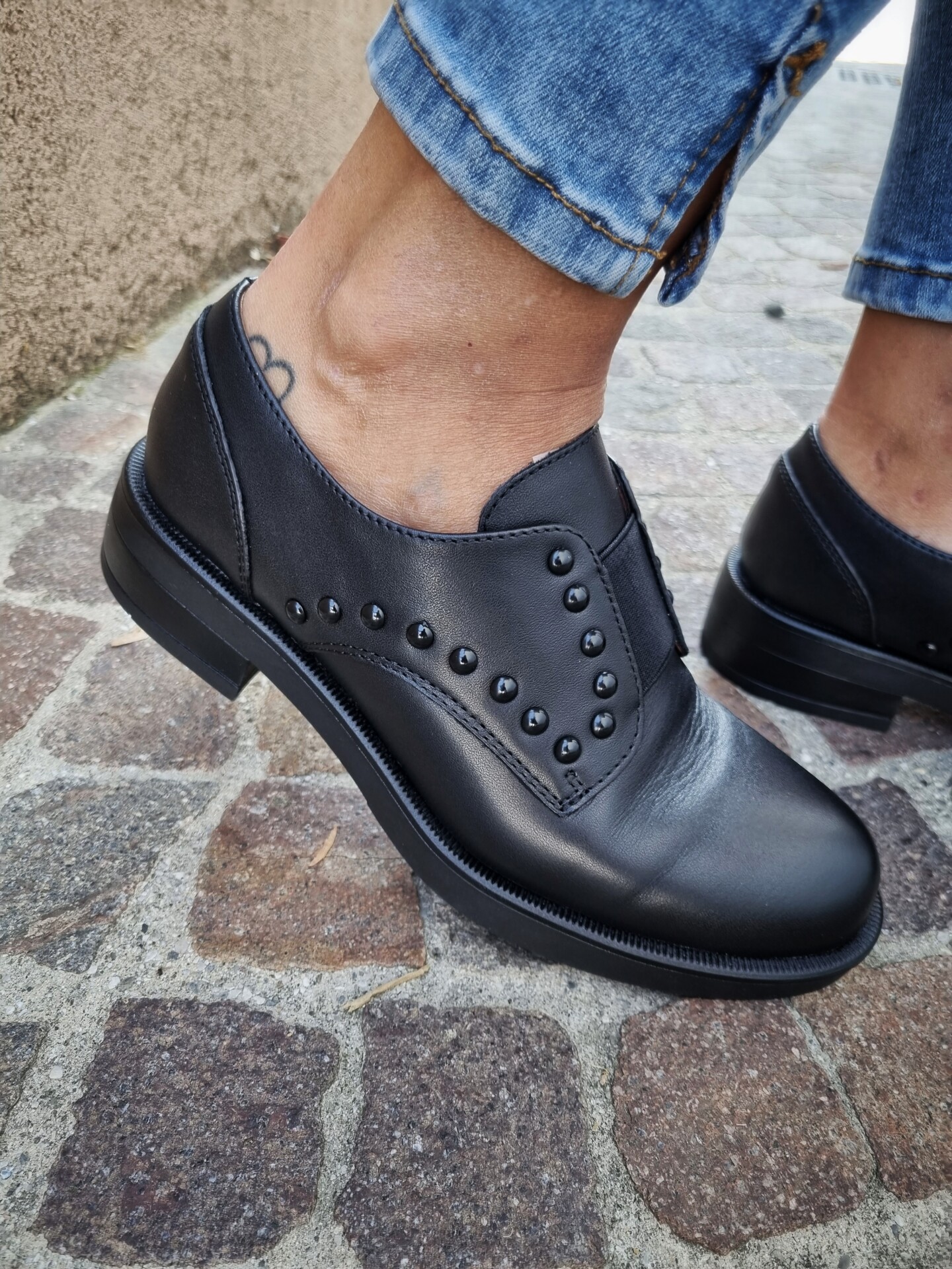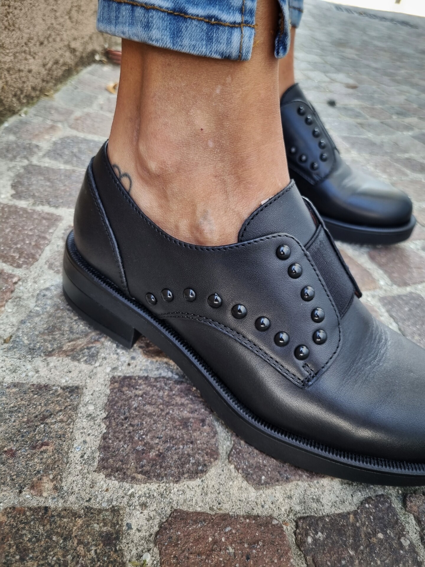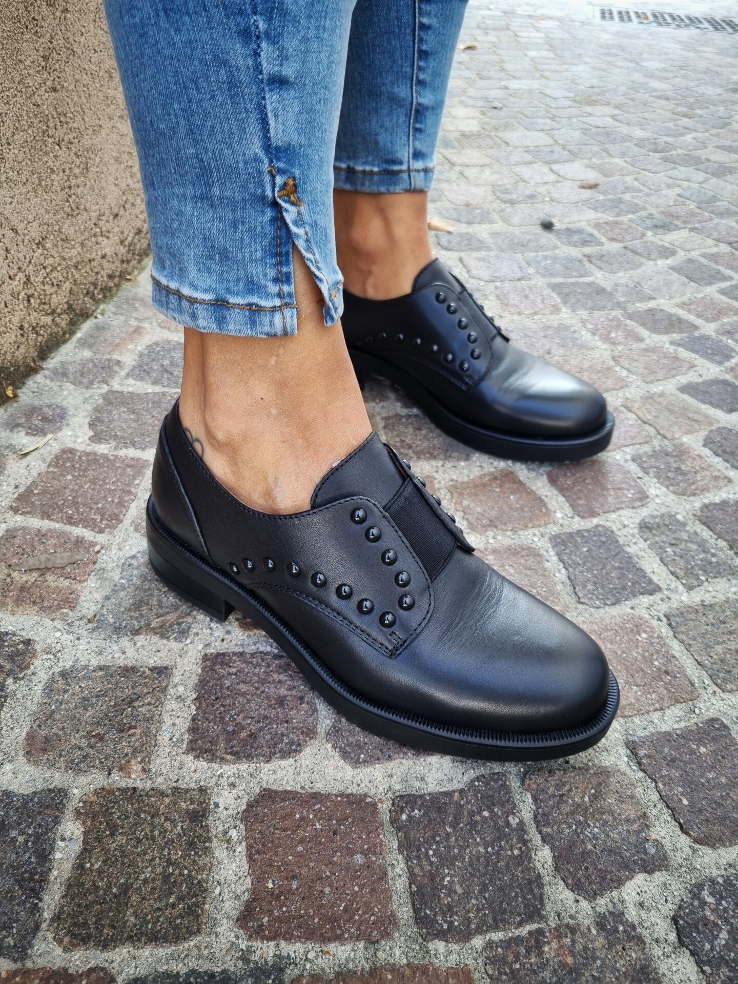 Derby easy fit in pelle con borchie. La calzata è facilitata dall’elastico sulla parte frontale della linguetta.