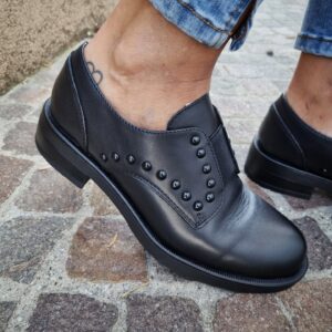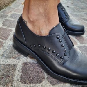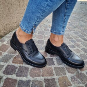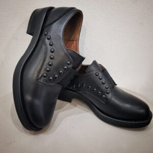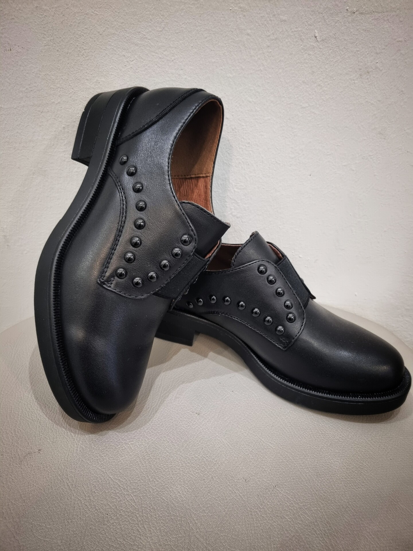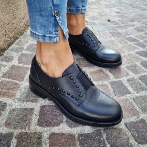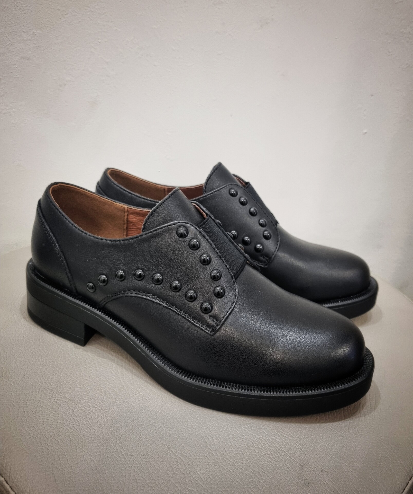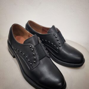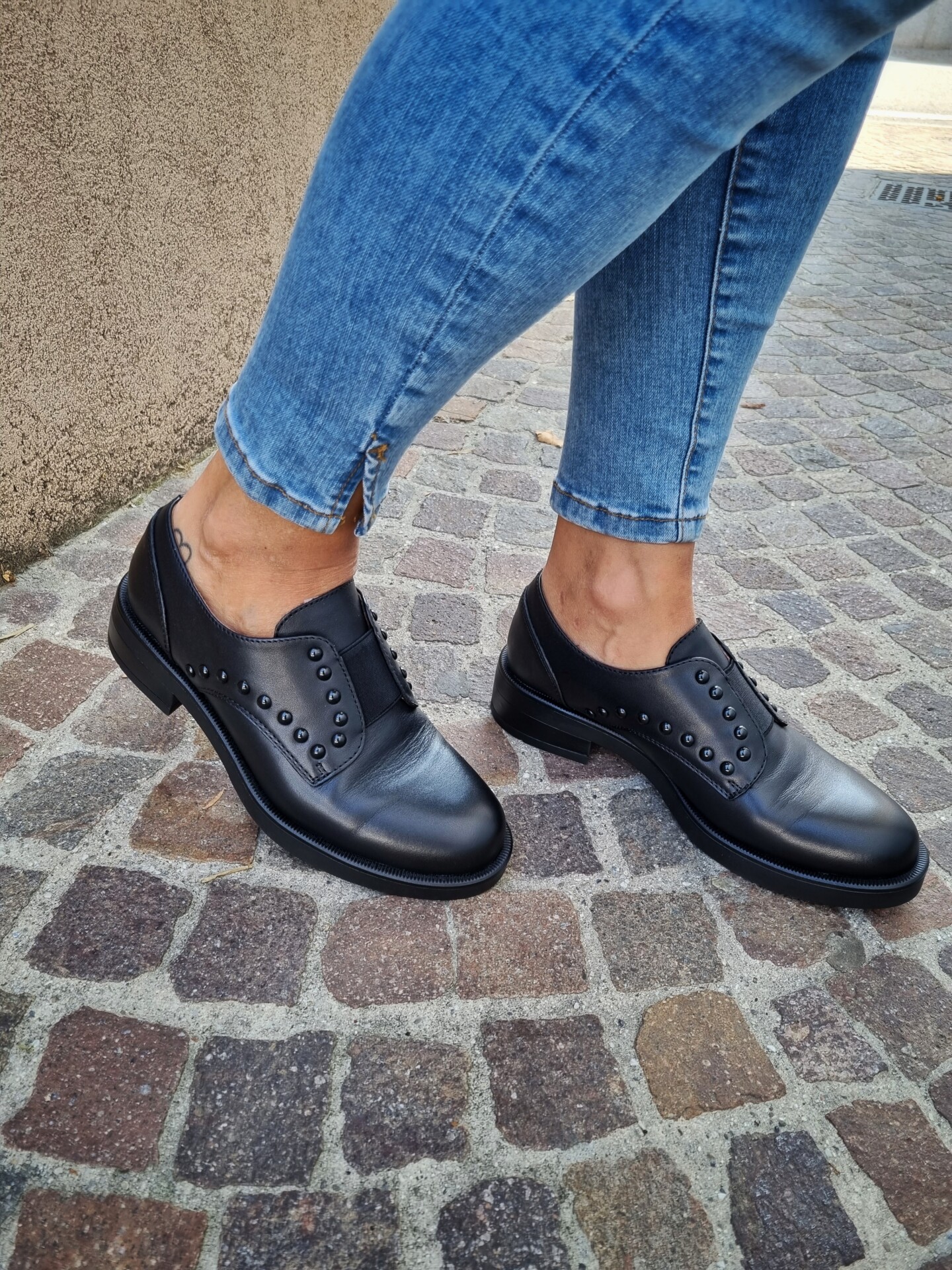 Derby easy fit in pelle con borchie. La calzata è facilitata dall’elastico sulla parte frontale della linguetta.