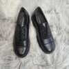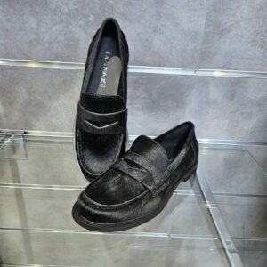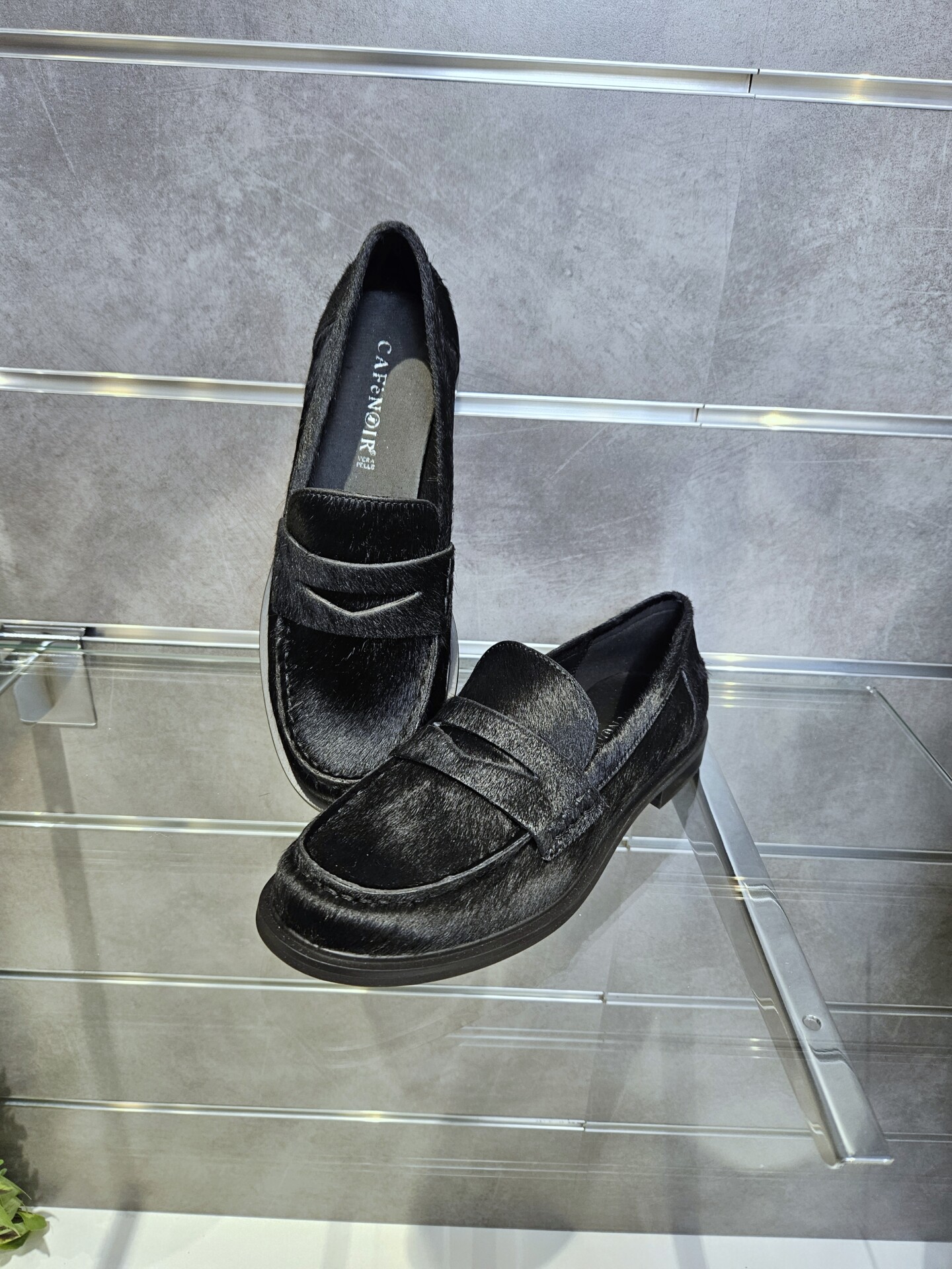 Mocassini da donna in pelle effetto cavallino nero e passante sul collo piede. sottopiede in pelle tacco basso da 2 cm. grinta e stile per ogni look.