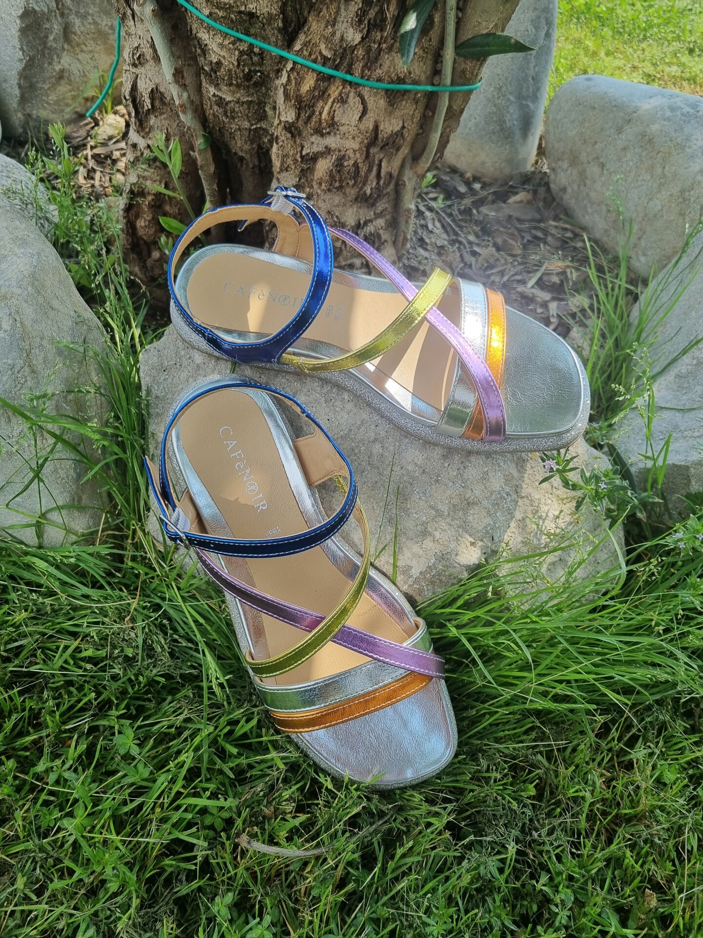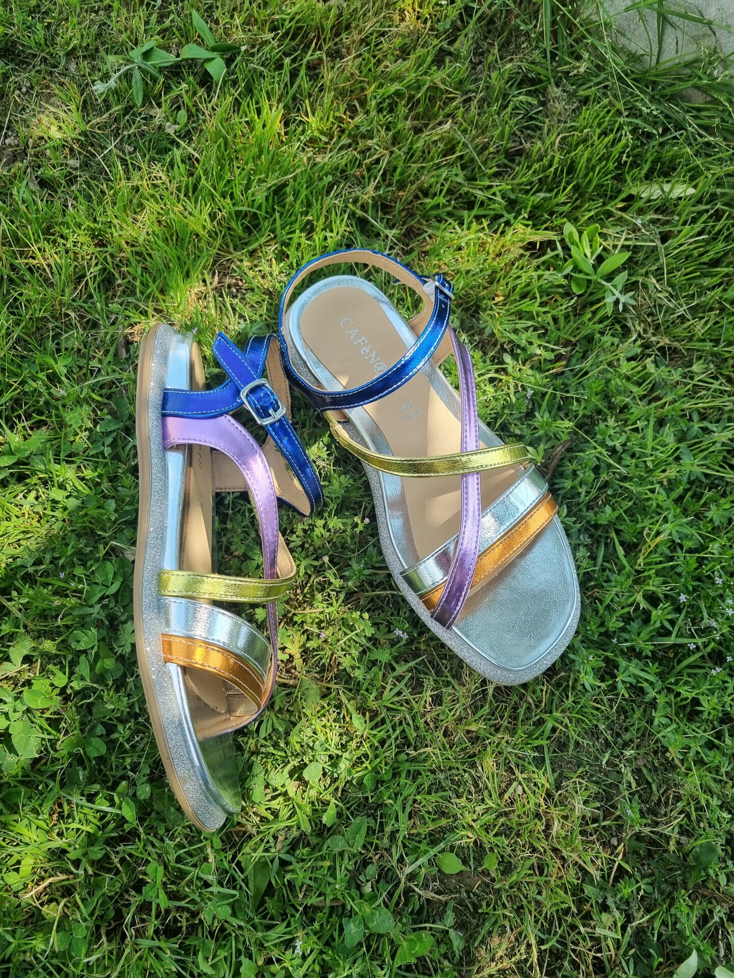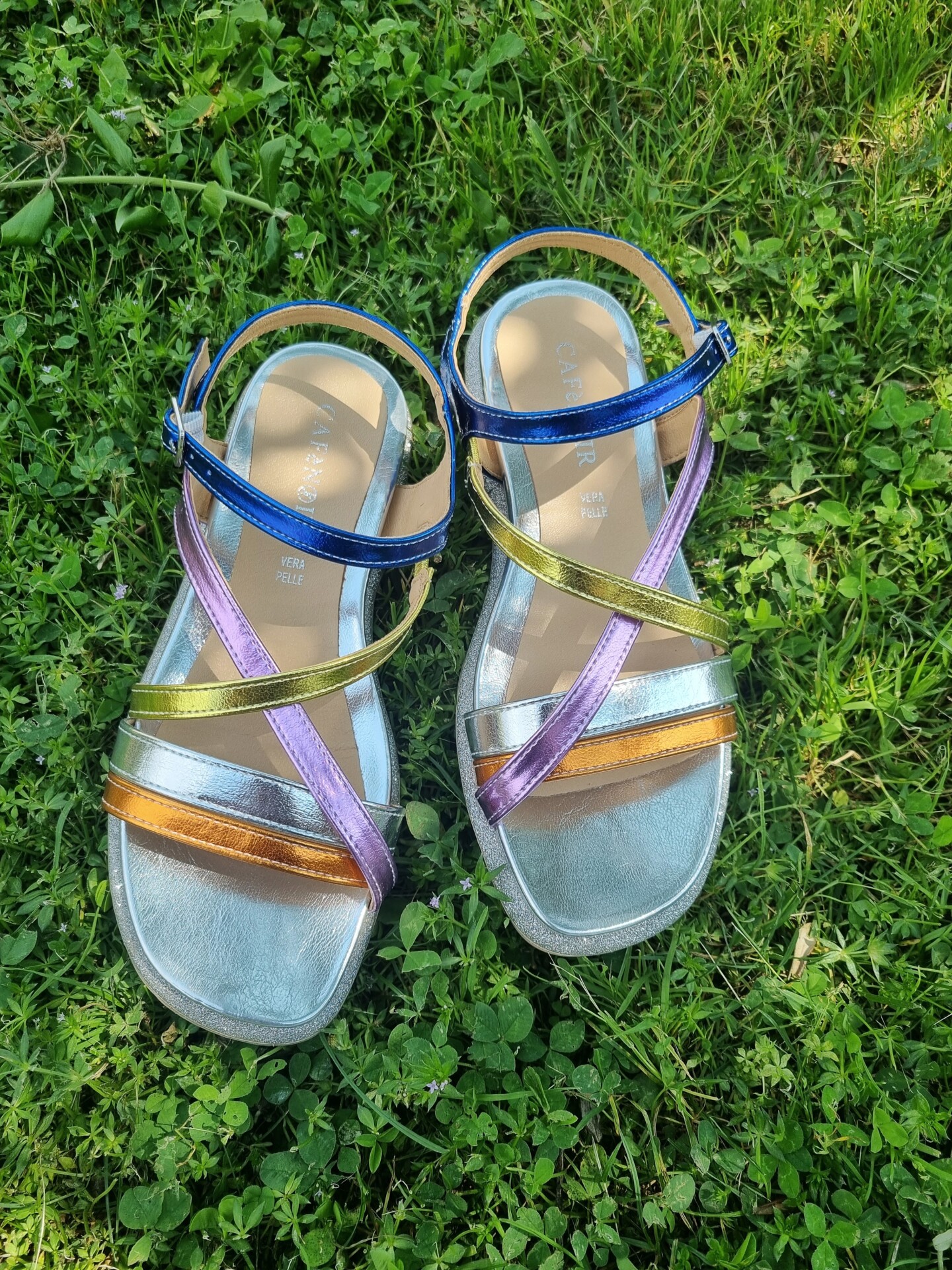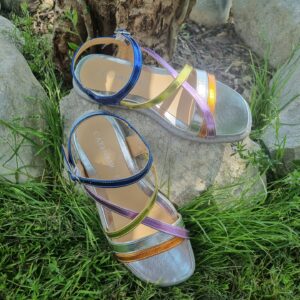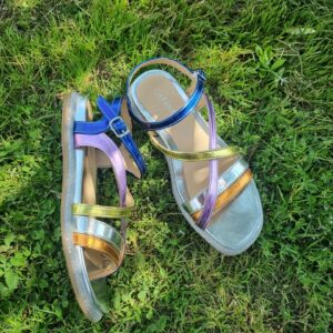 Sandali bassi in similpelle laminata con intreccio multicolore.