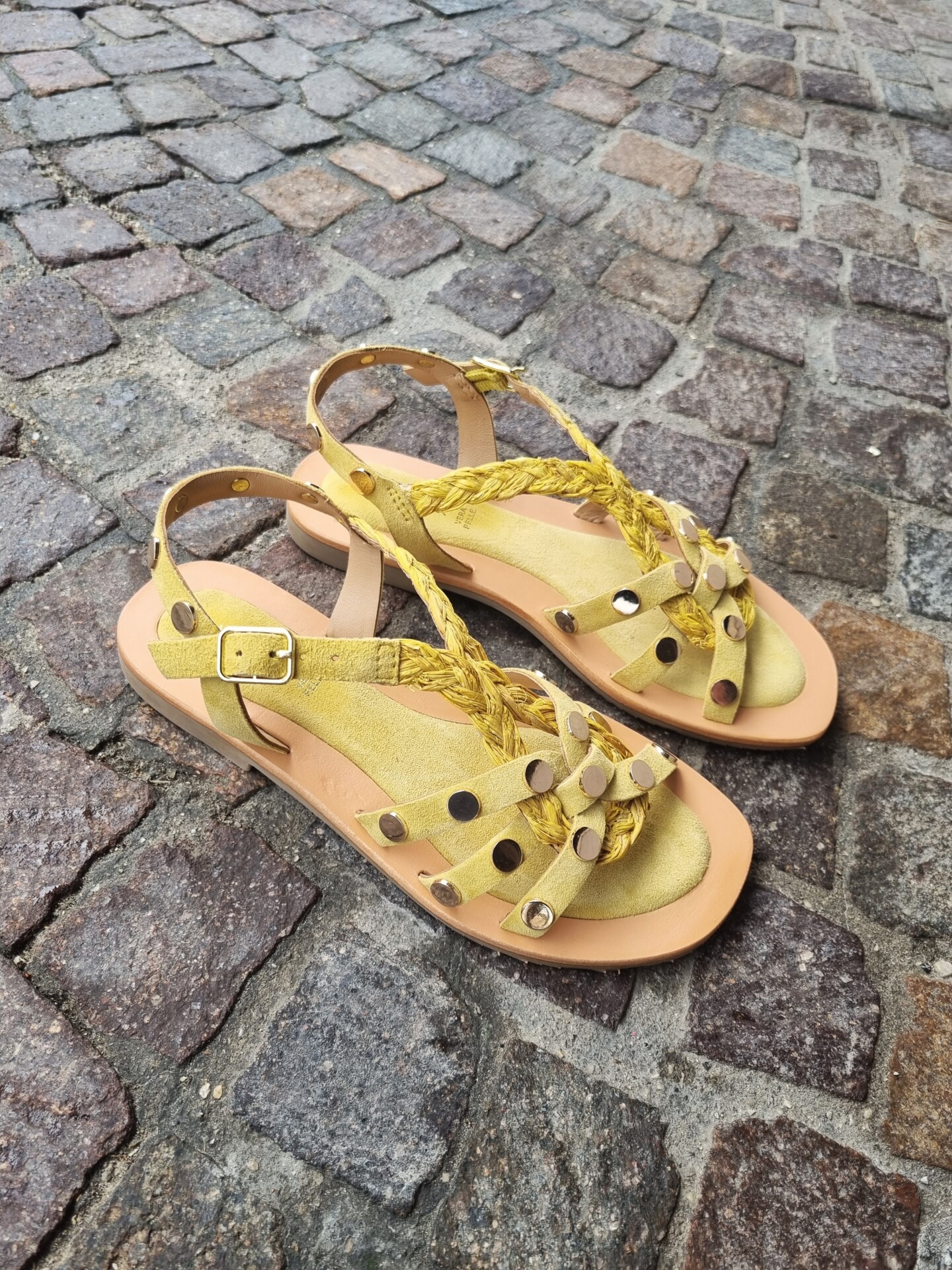 Sandali in pelle scamosciata e rafia intrecciata. borchie decorative completano l’insieme conferendo al sandalo un gusto boho chic.
