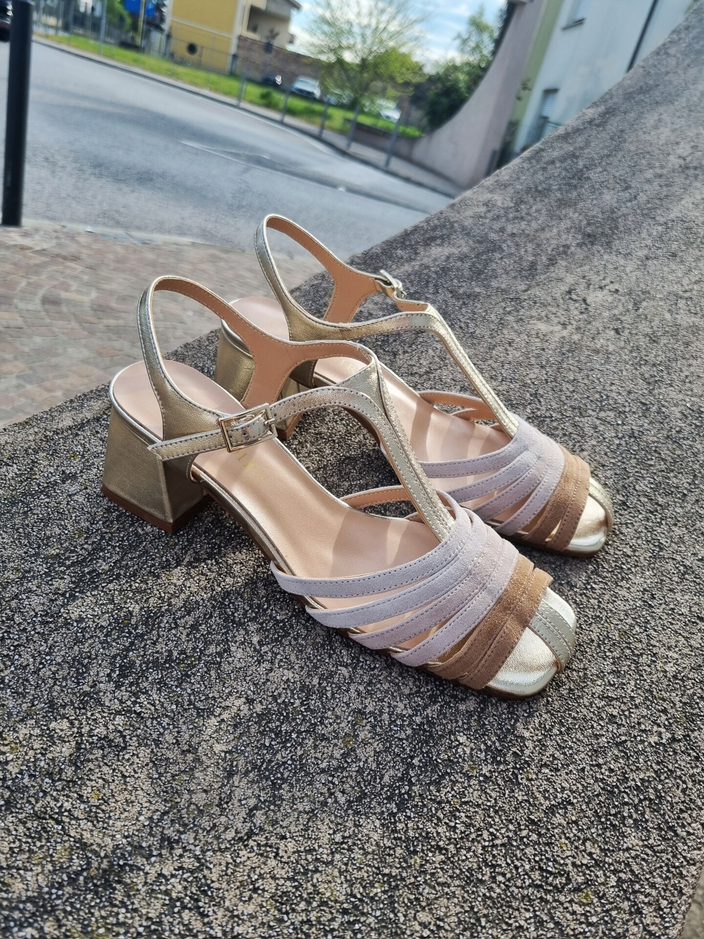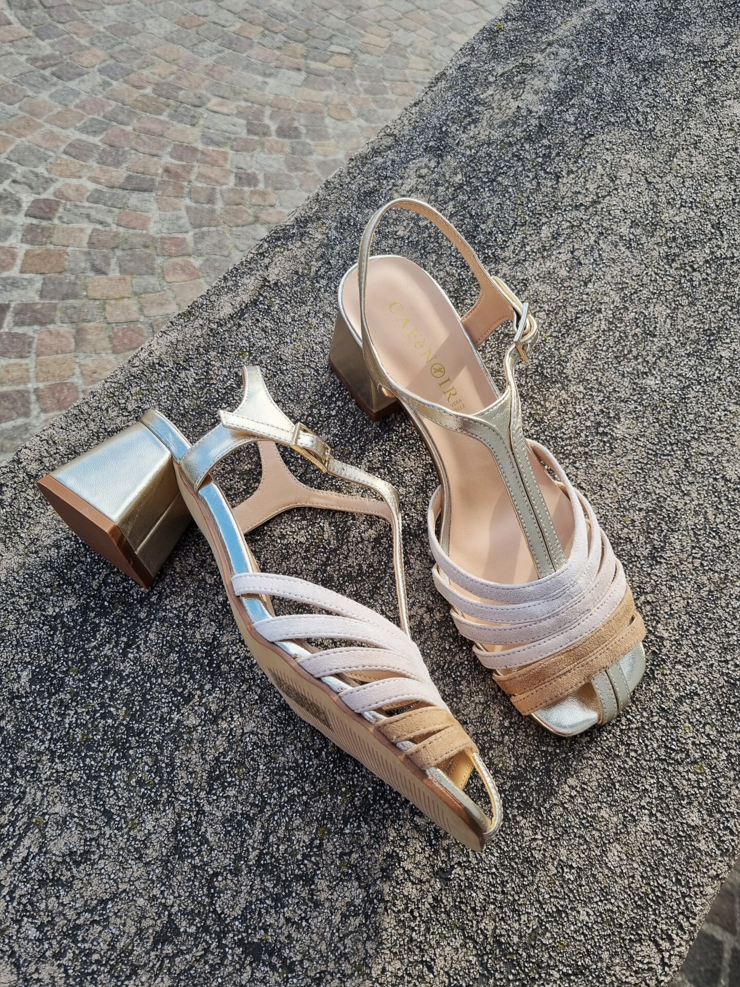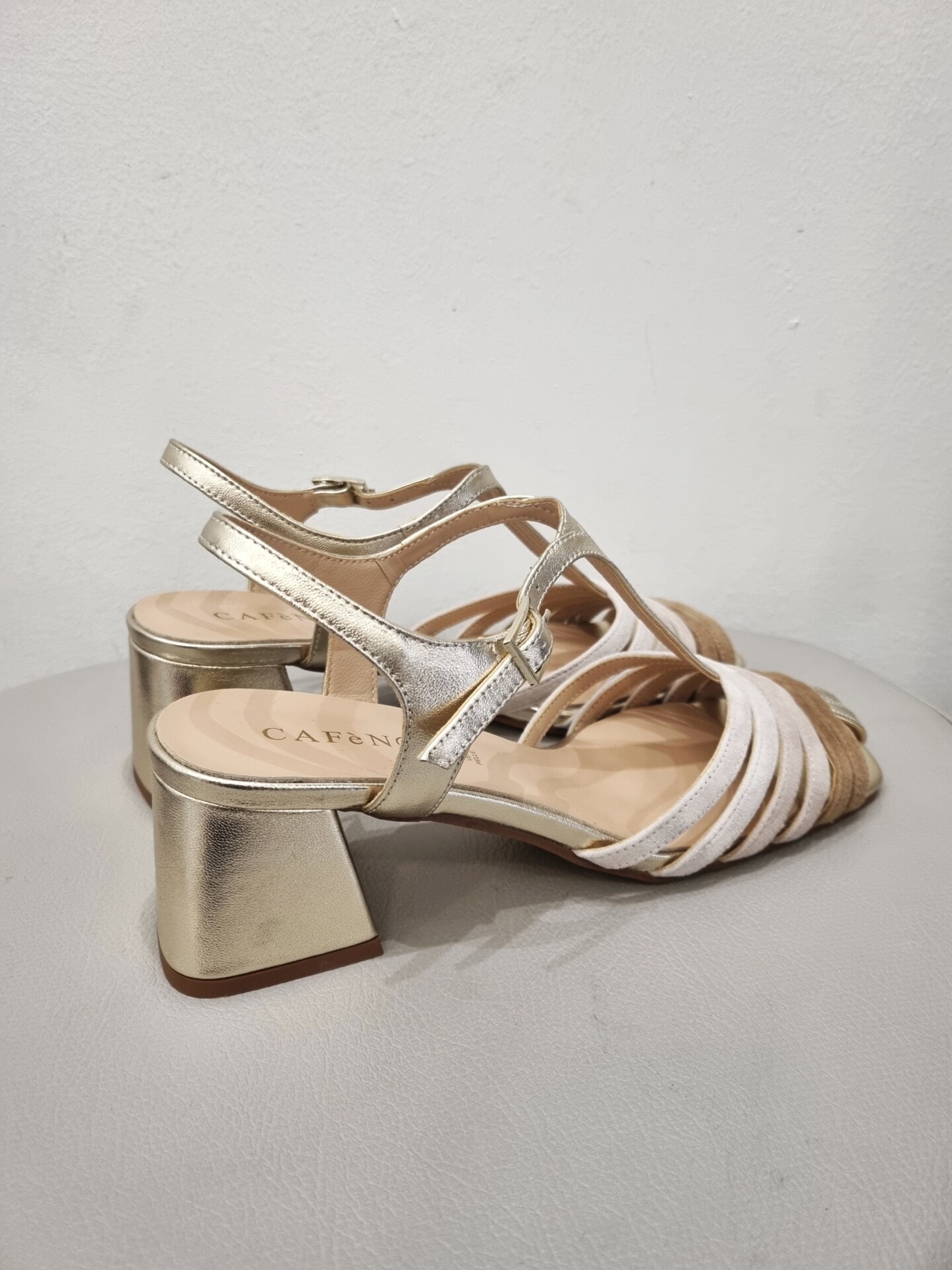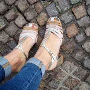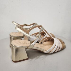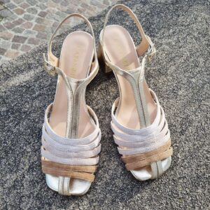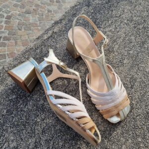Sandali gabbia modello gilda realizzati in camoscio e pelle laminata tacco 5 cm fasciato pelle