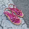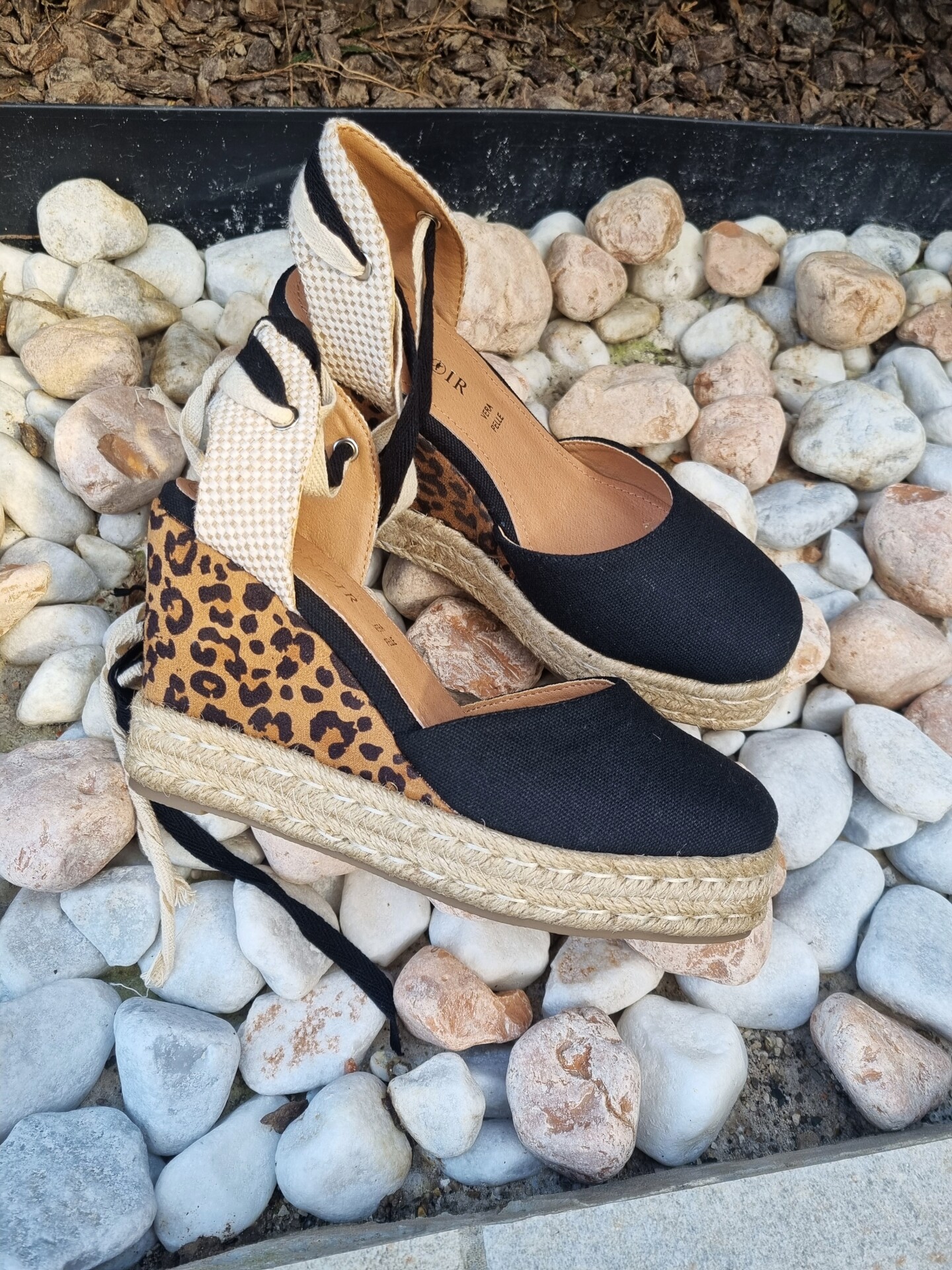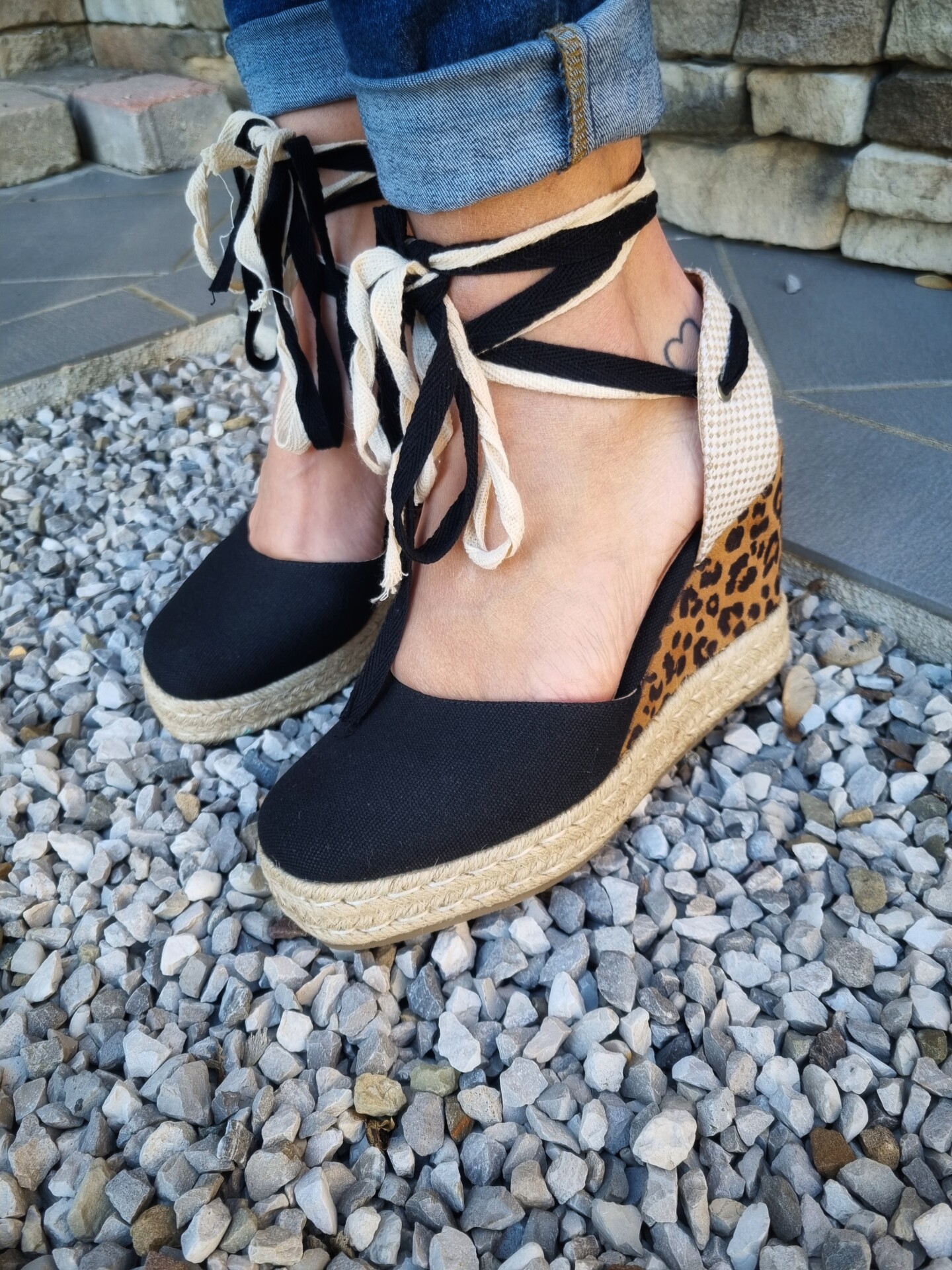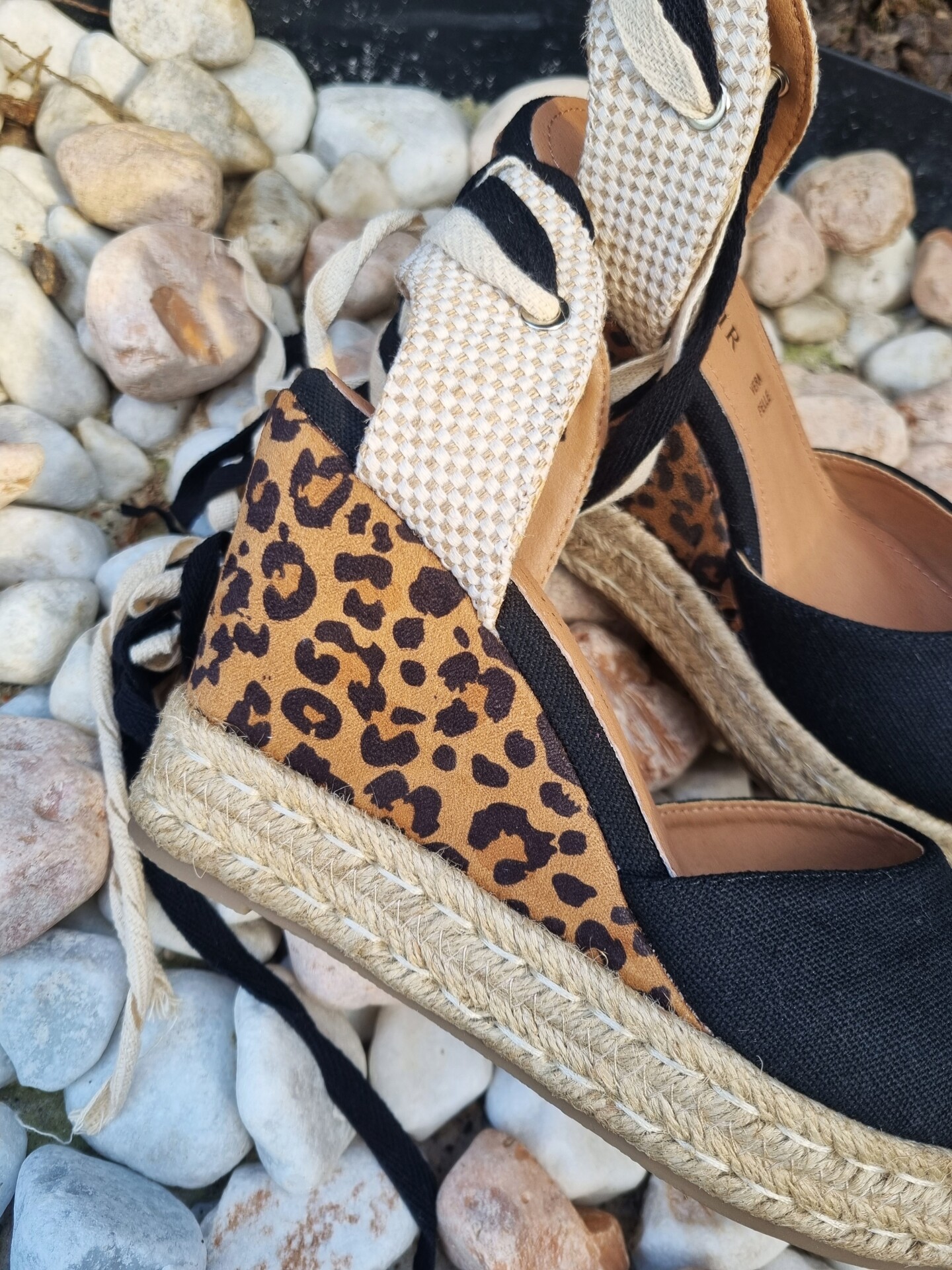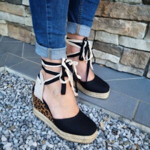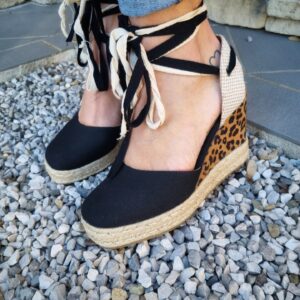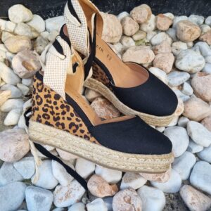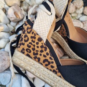 Sandali in cavas con doppio laccio alla schiava e zeppa in corda e tessuto stampa maculato.