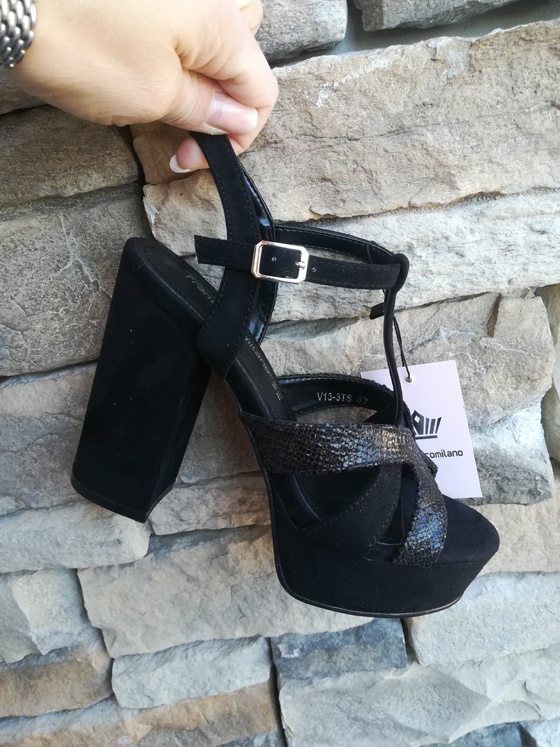 Sandalo con tacco in eco-camoscio con stringhette pitonate nere.
