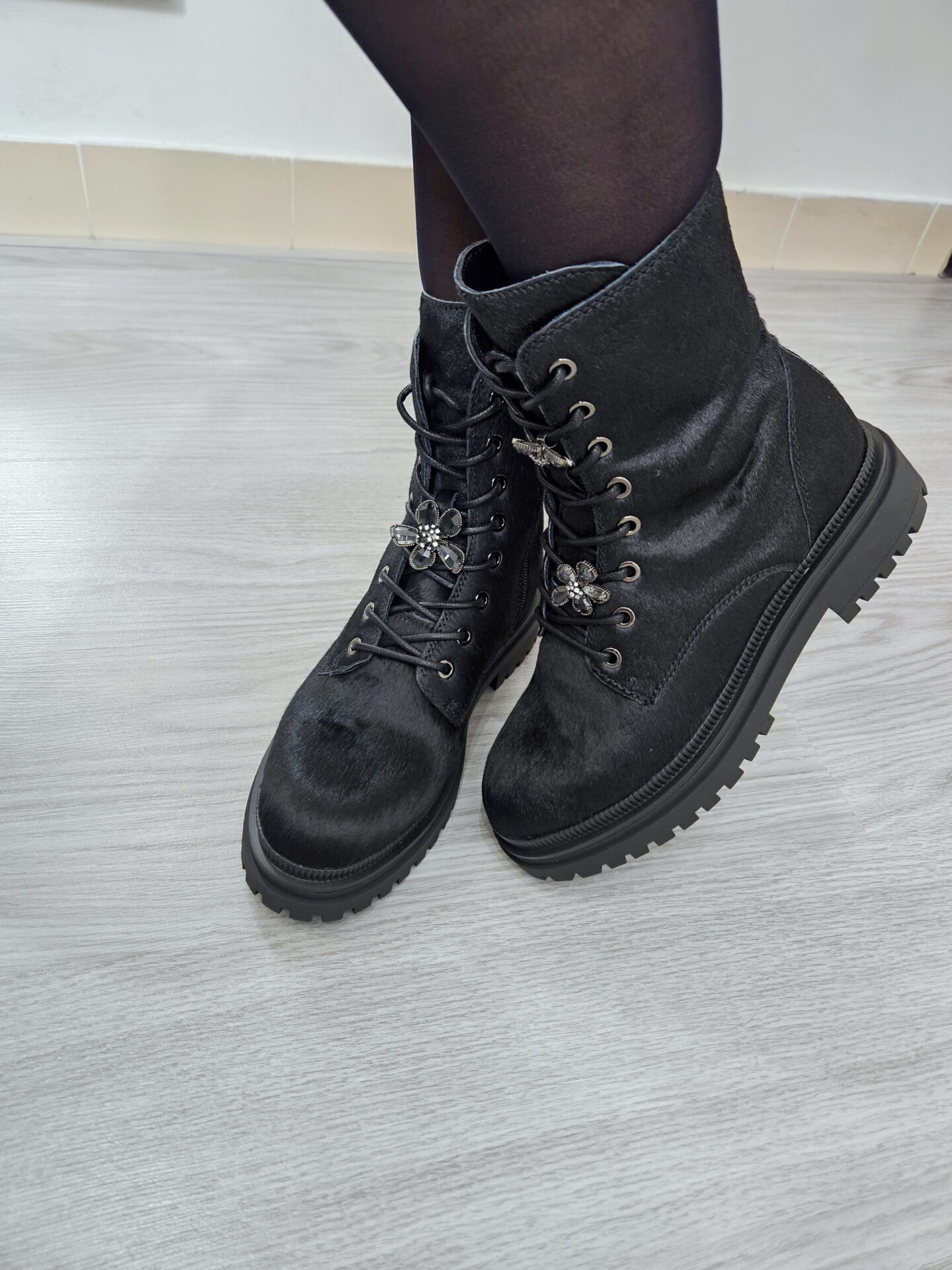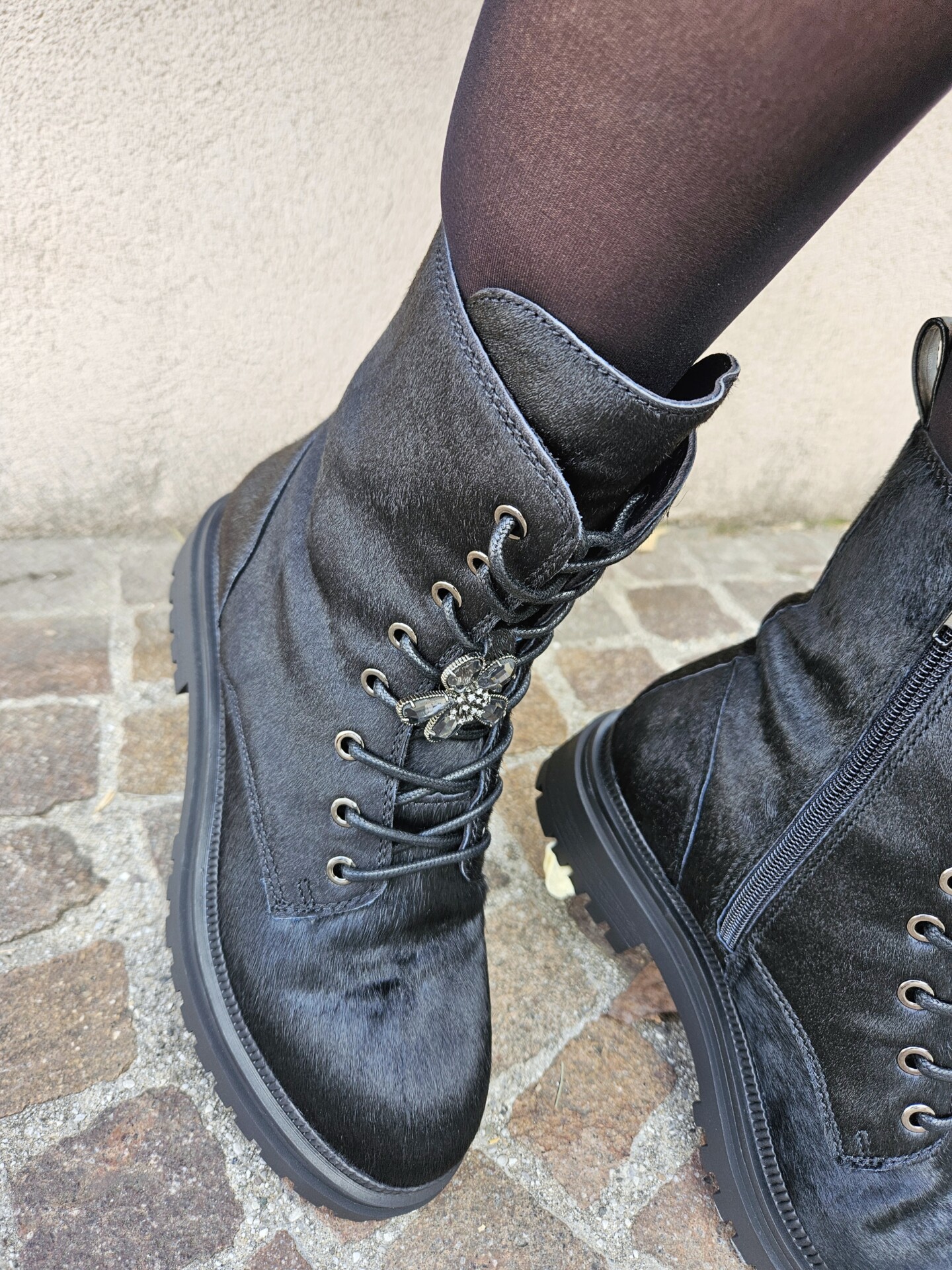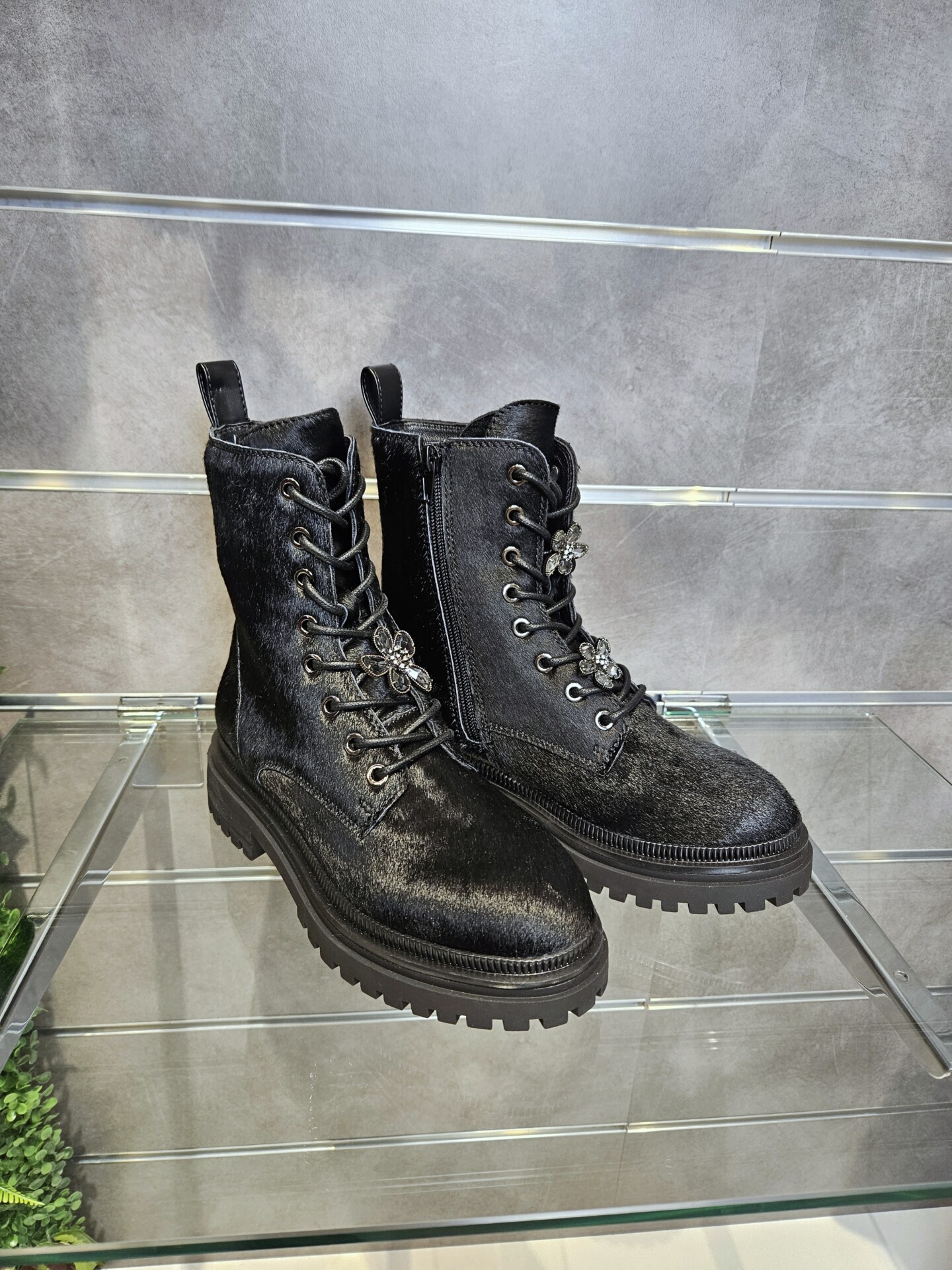 Questo audace anfibio in pelle pony nera combina texture e dettagli preziosi. La tomaia robusta conferisce un look unico. La classica allacciatura frontale è impreziosita da gioielli a fiore con effetto cristallo, che aggiungono un tocco di luce e femminilità al design grintoso.