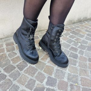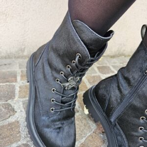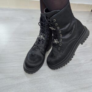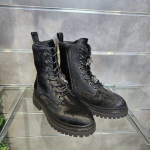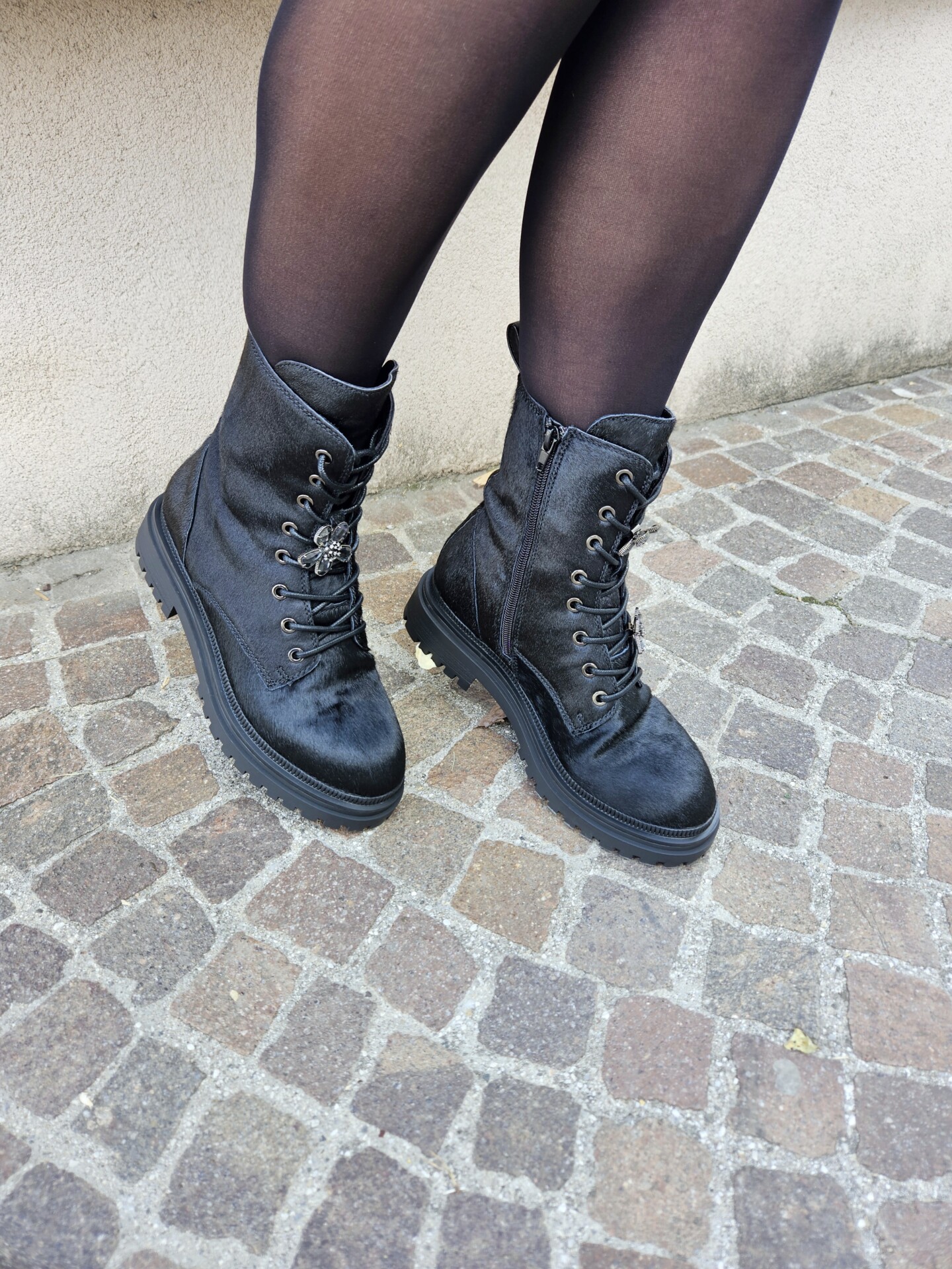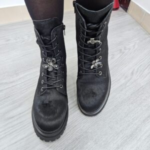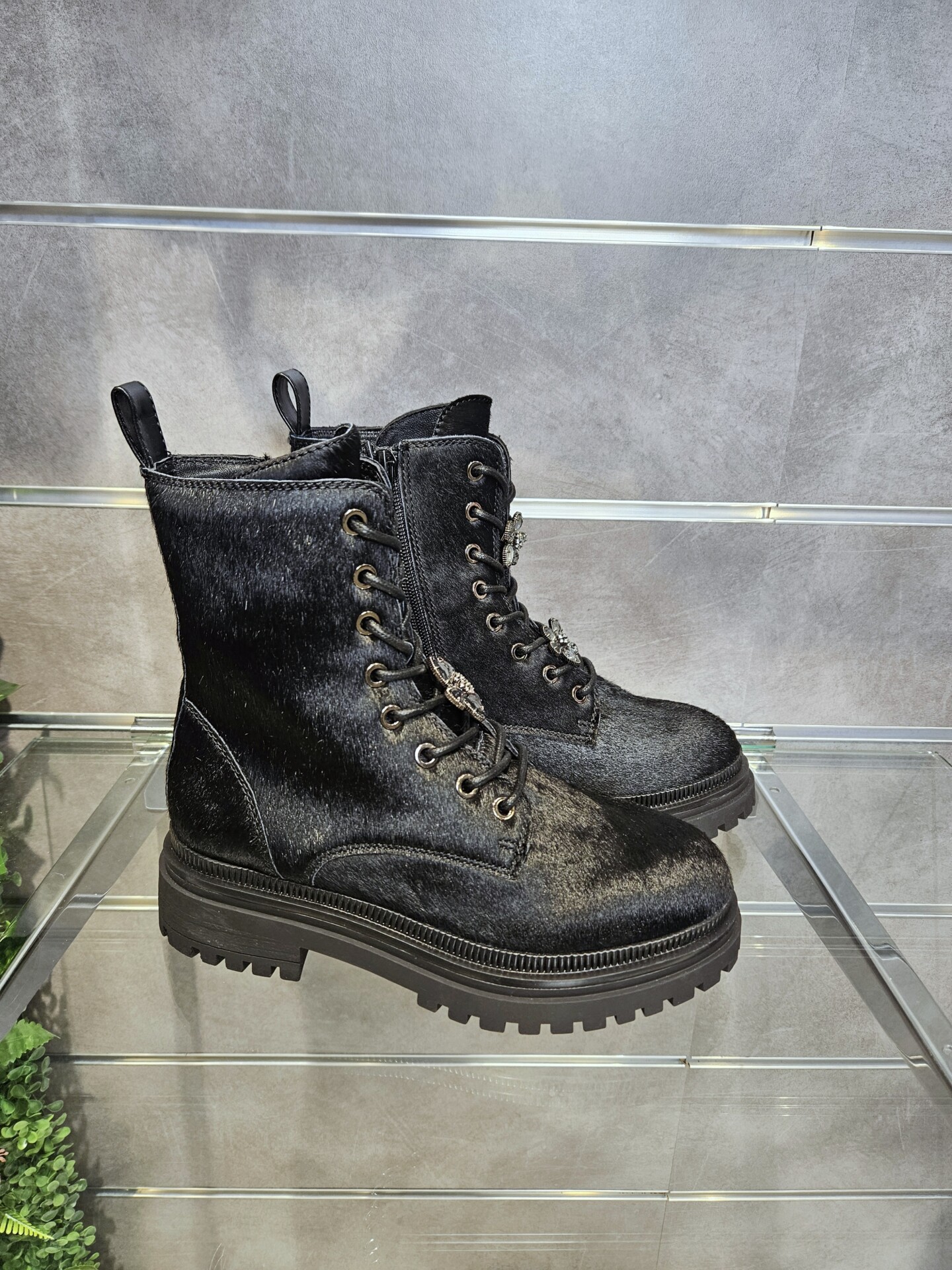 Questo audace anfibio in pelle pony nera combina texture e dettagli preziosi. La tomaia robusta conferisce un look unico. La classica allacciatura frontale è impreziosita da gioielli a fiore con effetto cristallo, che aggiungono un tocco di luce e femminilità al design grintoso.