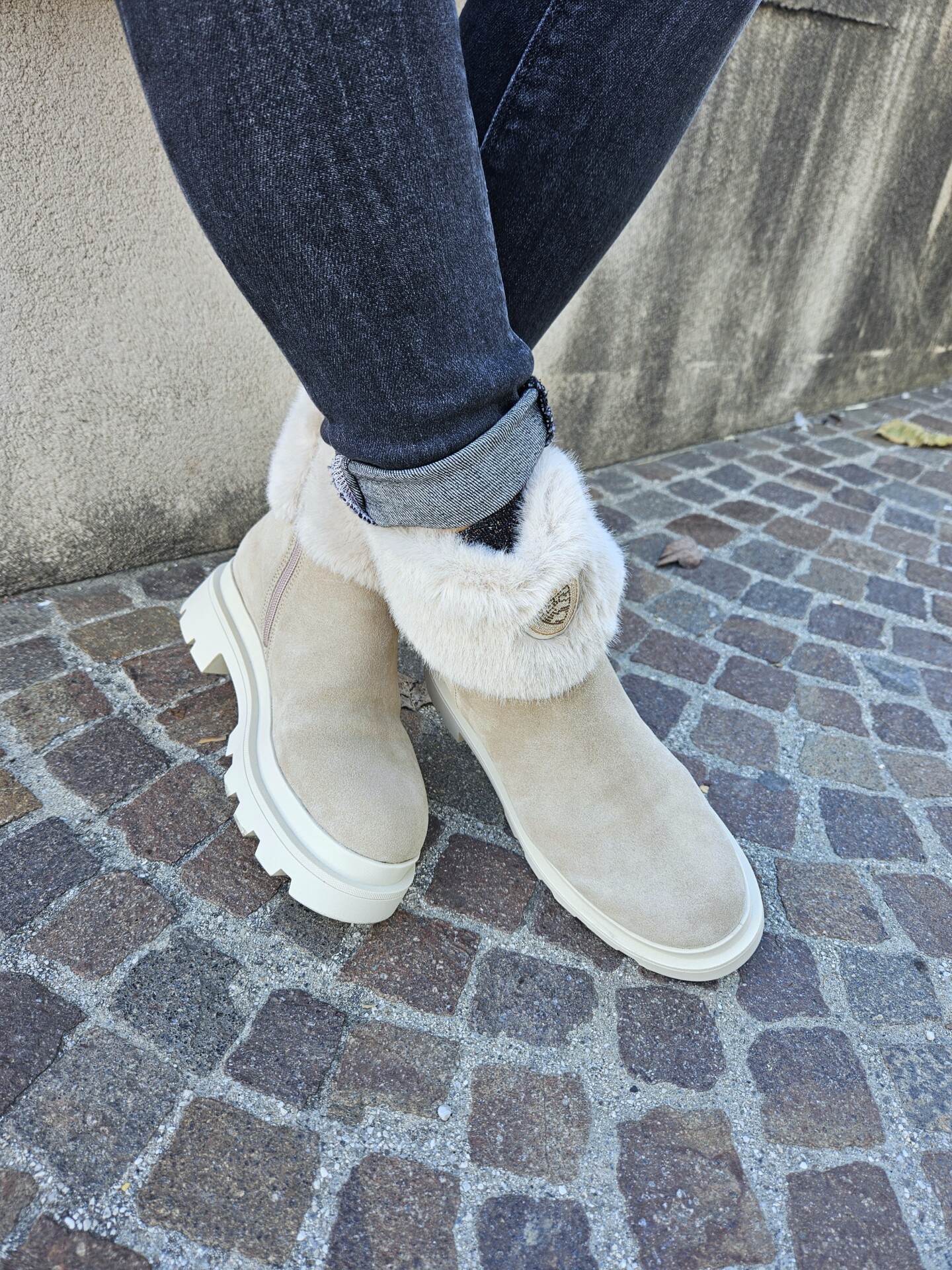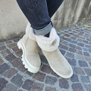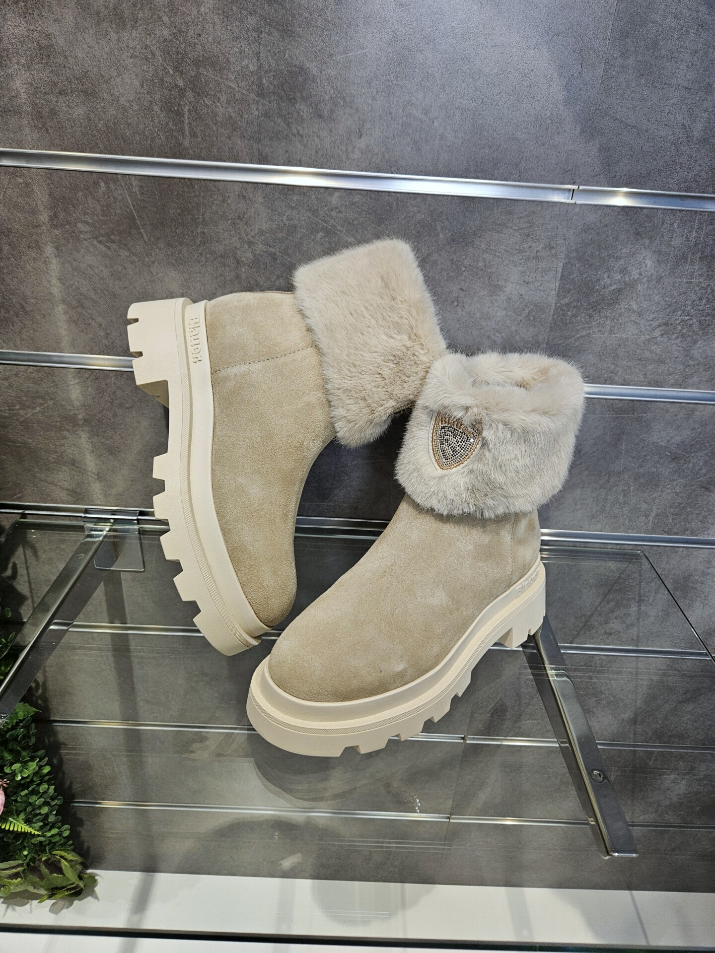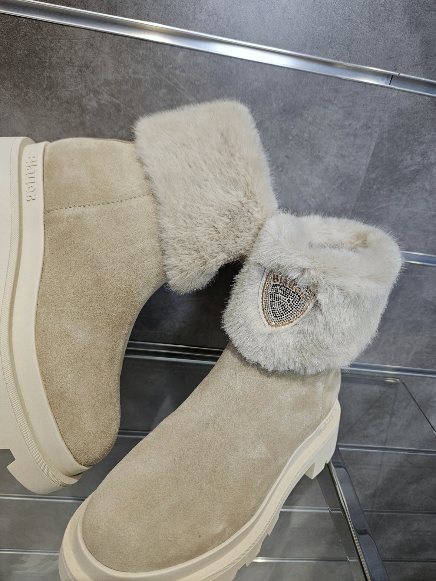 Il modello KIMMEL10 è un polacchino da donna in pelle scamosciata, con una suola a carrarmato robusta e spessa. Il tocco distintivo è il risvolto in materiale effetto pelliccia che avvolge la parte superiore della caviglia, impreziosito dall’iconico scudetto Blauer frontale luccicante. All’interno fodera in materiale effetto pelliccia e soletta estraibile in pelle. Questo stivaletto unisce comfort e stile, ideale per un look invernale.
