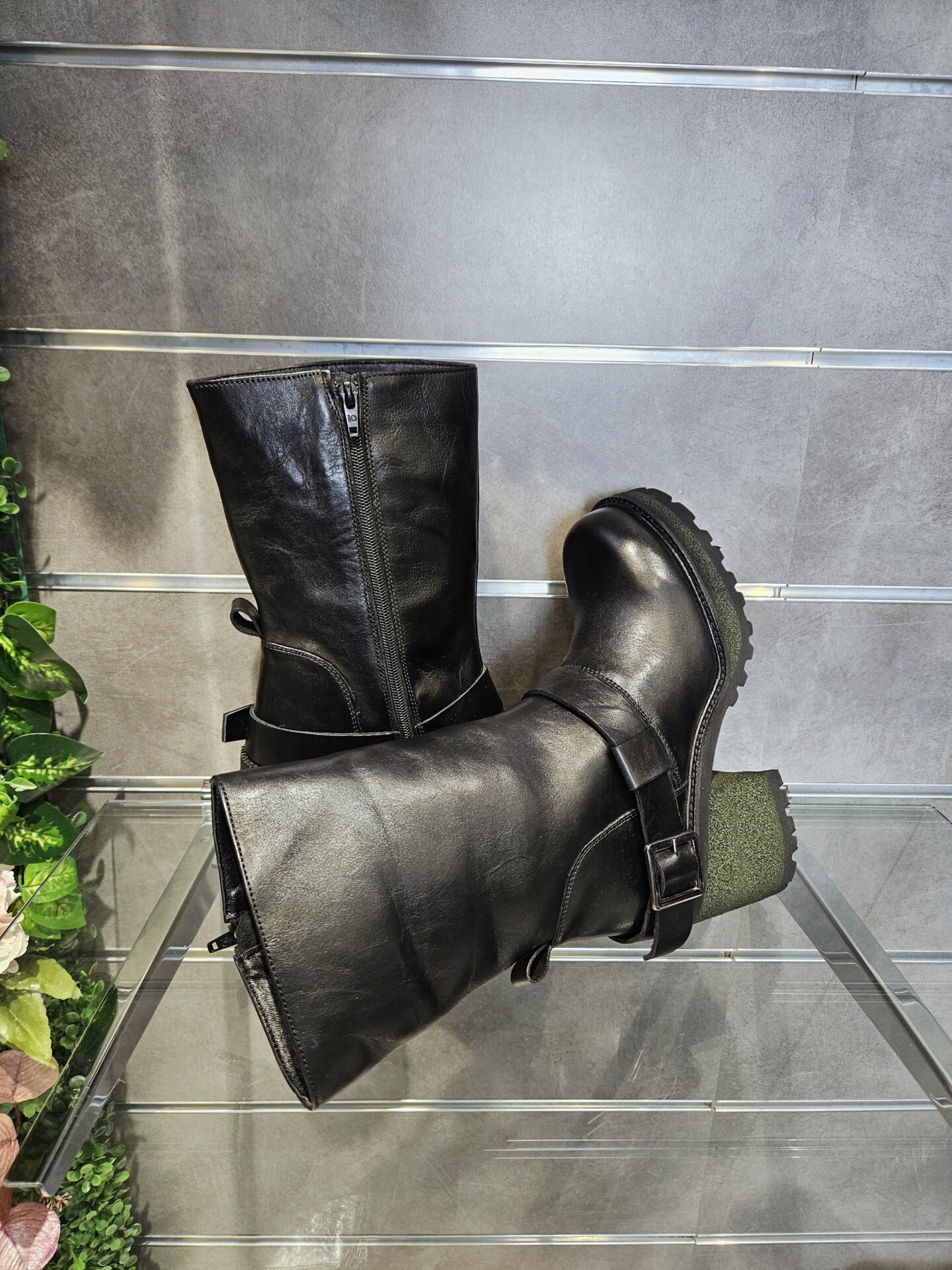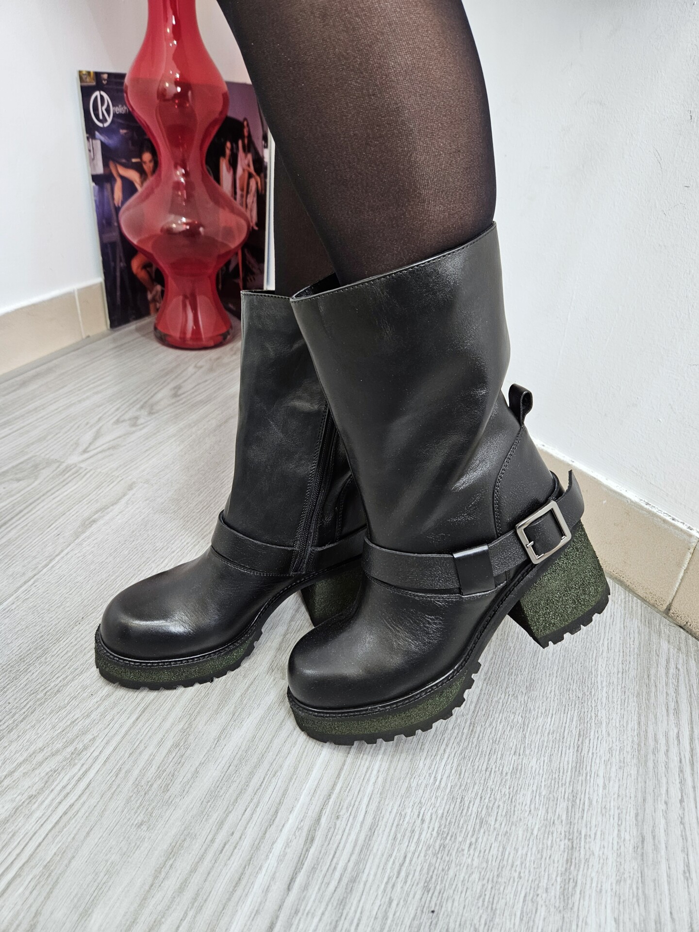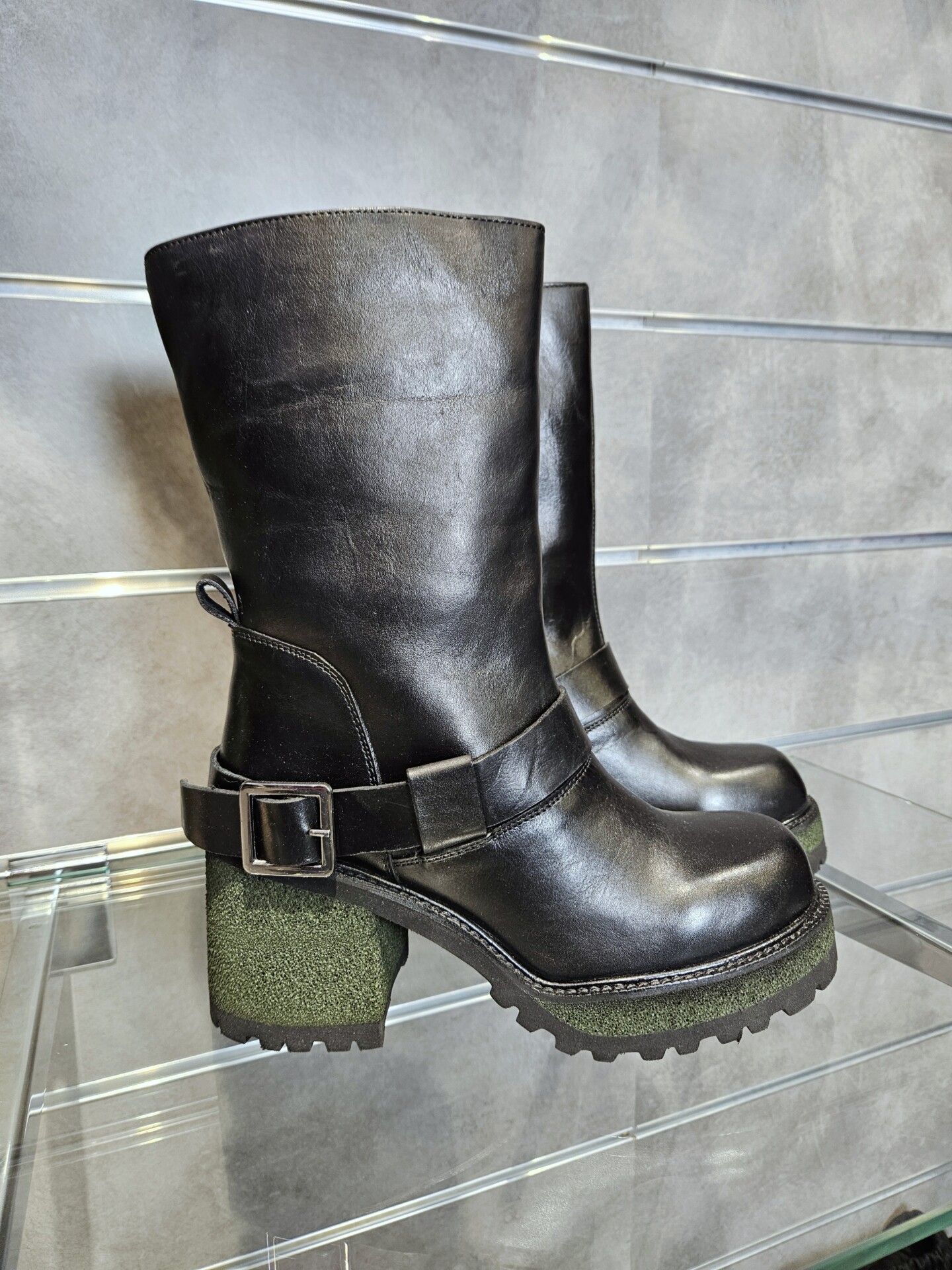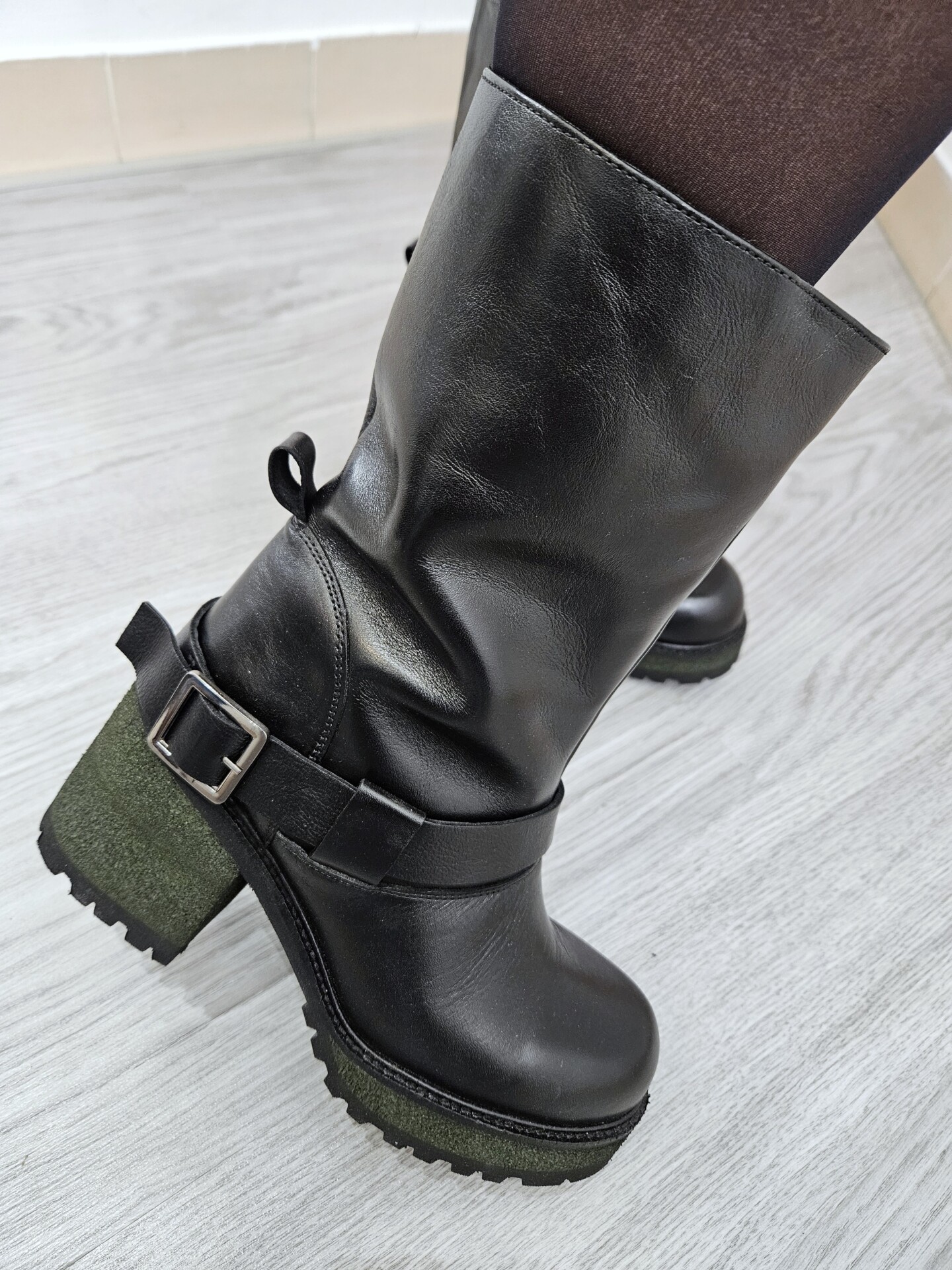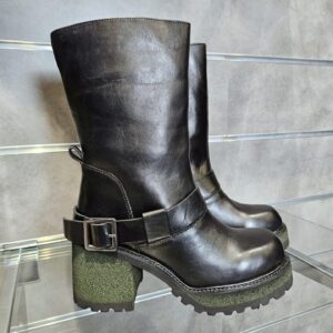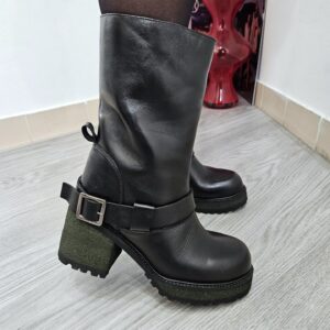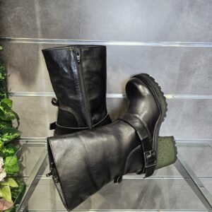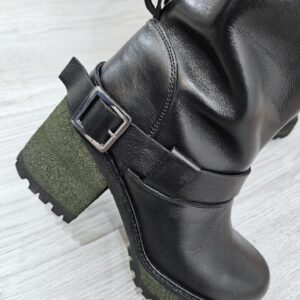 Stivaletti in pelle nera con cavigliera e fibbia tacco alto 9 cm rivestito effetto suede suola carrarmato. interno con zip e soletto in pelle. grinta e stile per l’inverno.