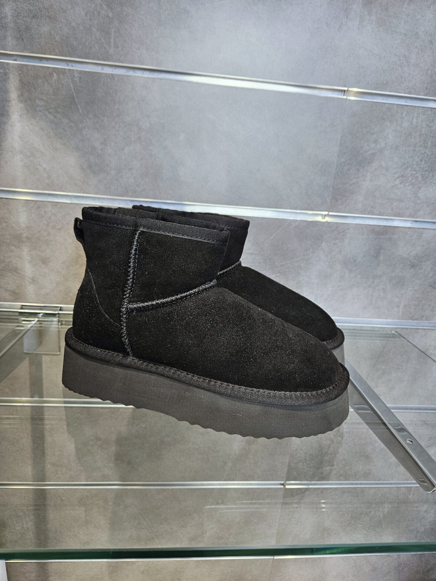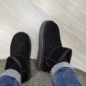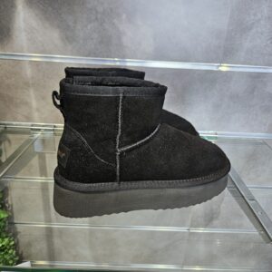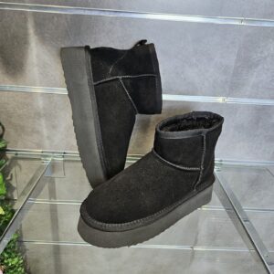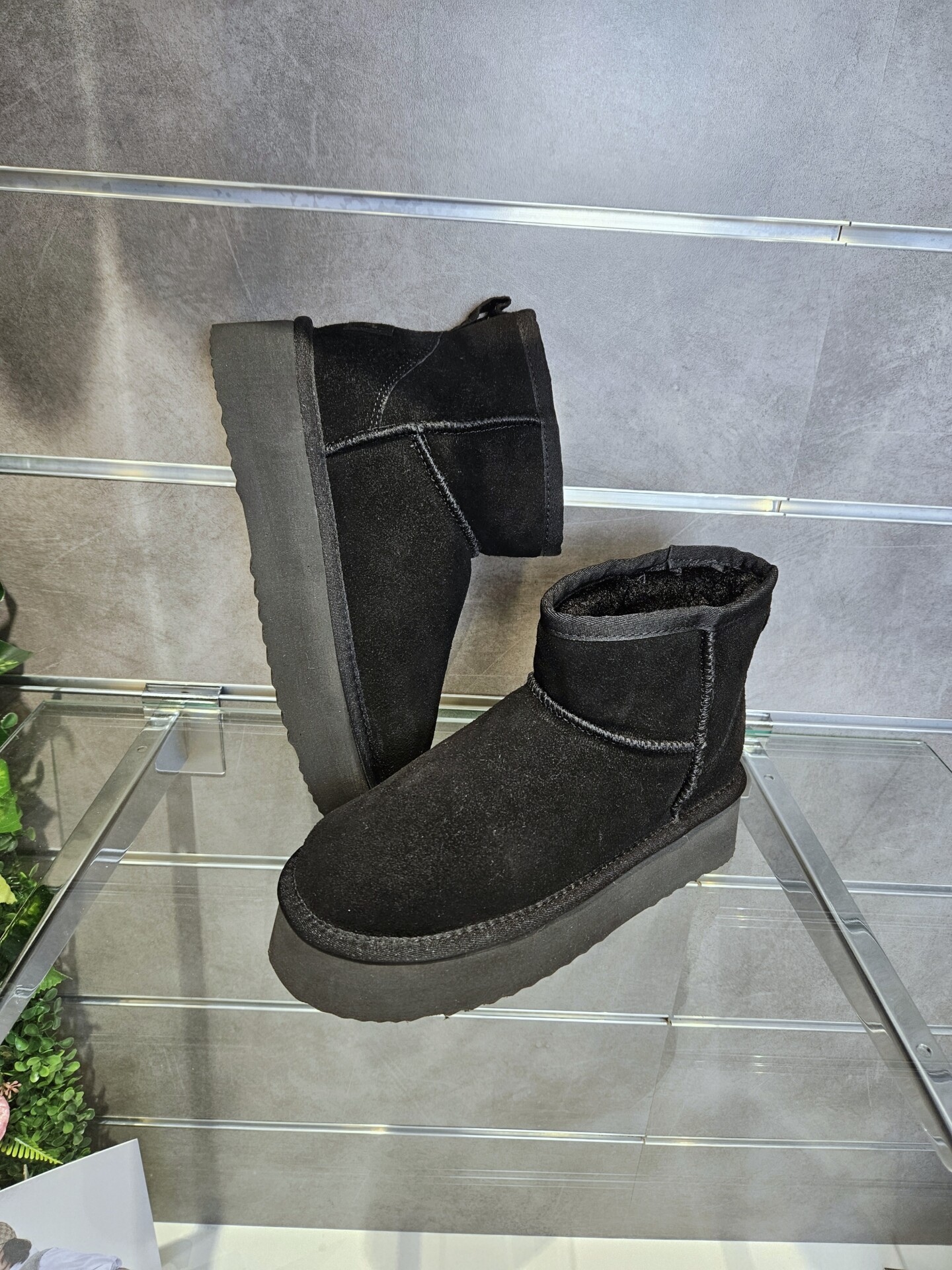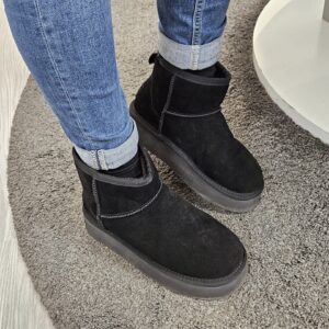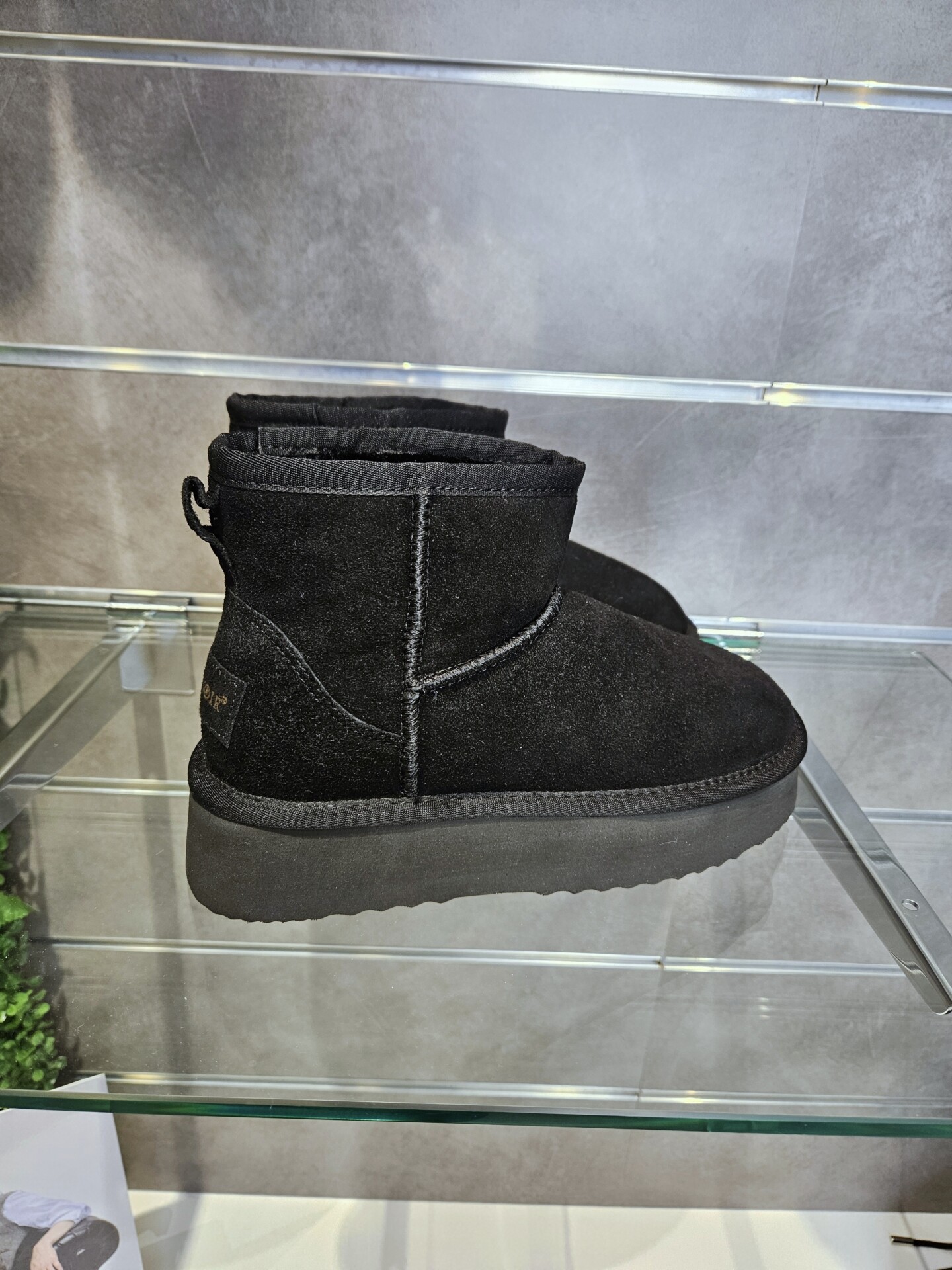 Tronchetti in pelle scamosciata con interno in pelliccia sintetica ideale per l’inverno. logo cafènoir in metallo posizionato sul retro della calzatura. suola platform 4 cm. comfort calore e stile in un solo stivalitto casual chic.