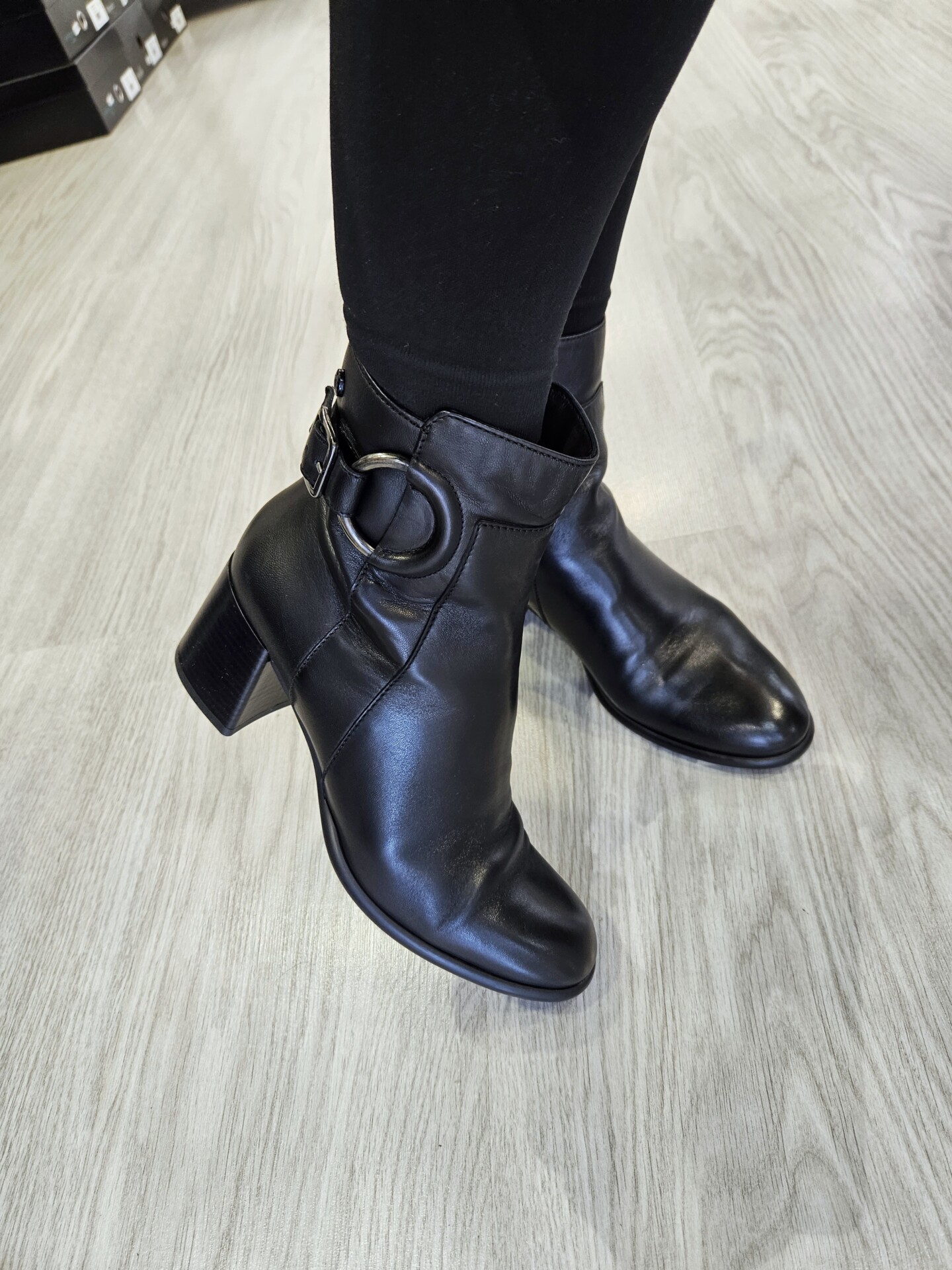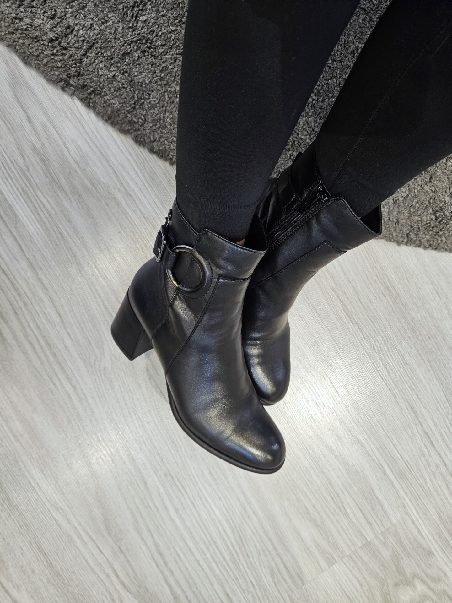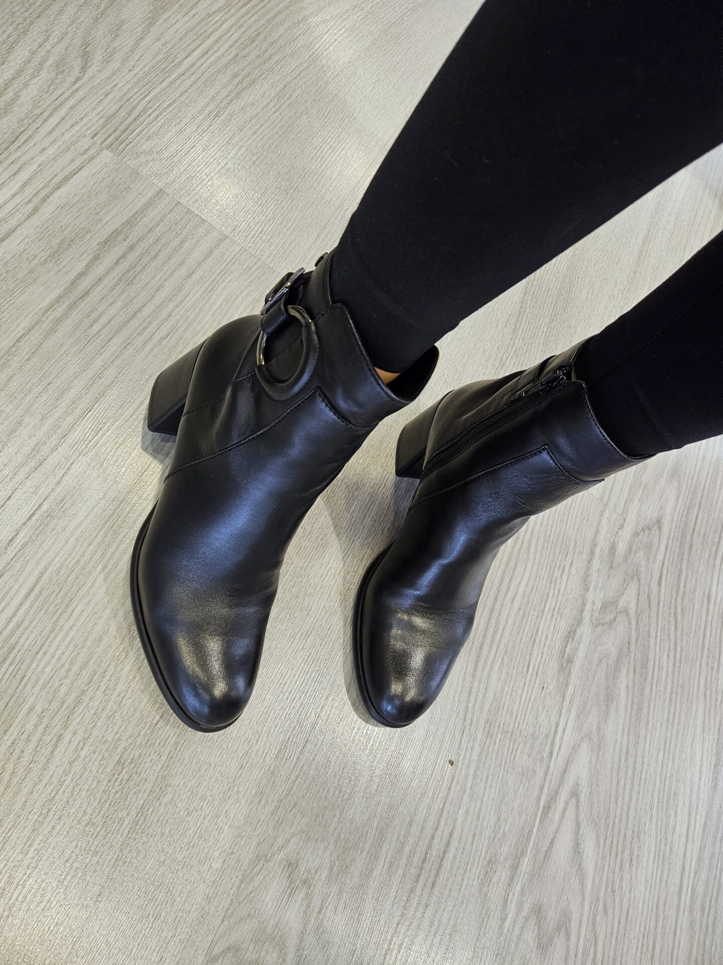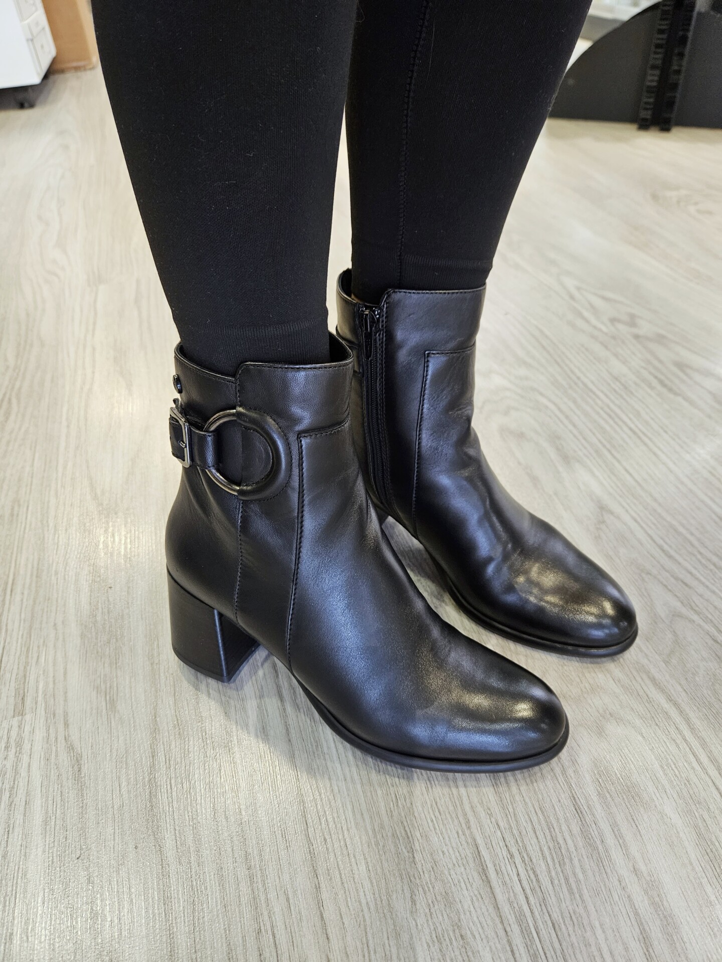 Tronchetto in pelle con fibbia laterale ed anello inserito a decoro. tacco da 60mm e soletto in pelle. ideale in abbinamento a molteplici look da mattina a sera.