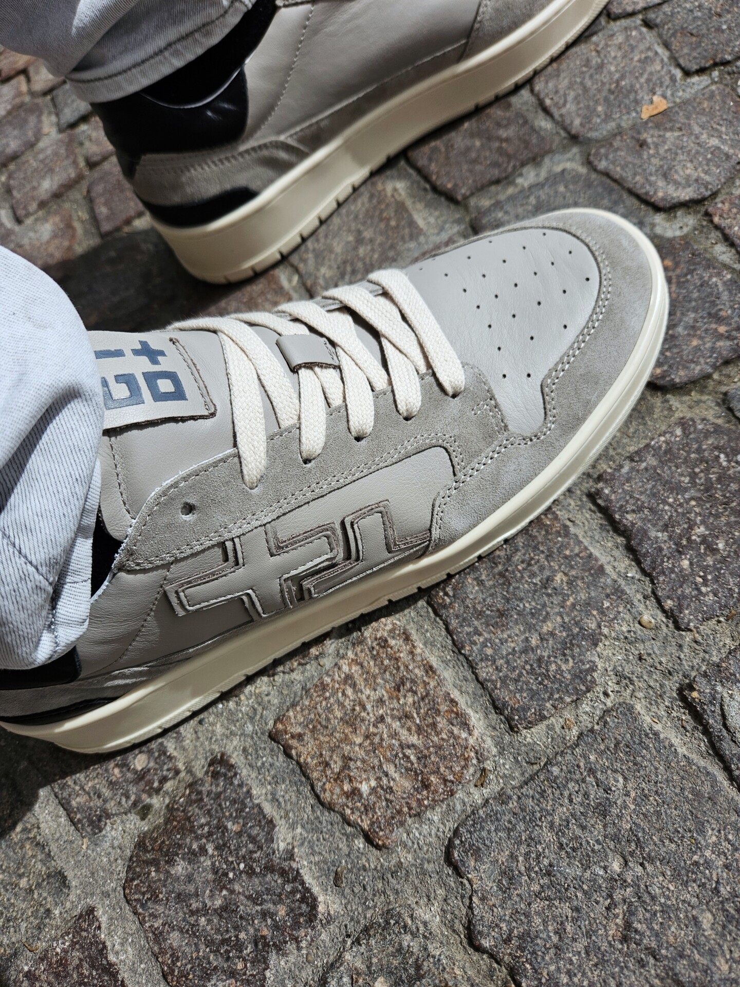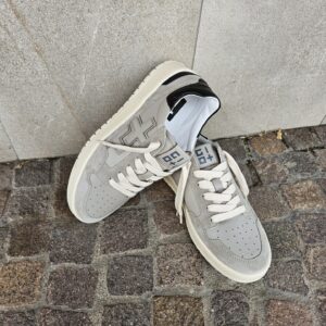 Sneakers GIO+ in pelle di vitello di colore grigio. Caratterizzata dal + + sulla parte esterna, targhetta sulla linguetta con il logo in grigio, lacci piatti in cotone beige.